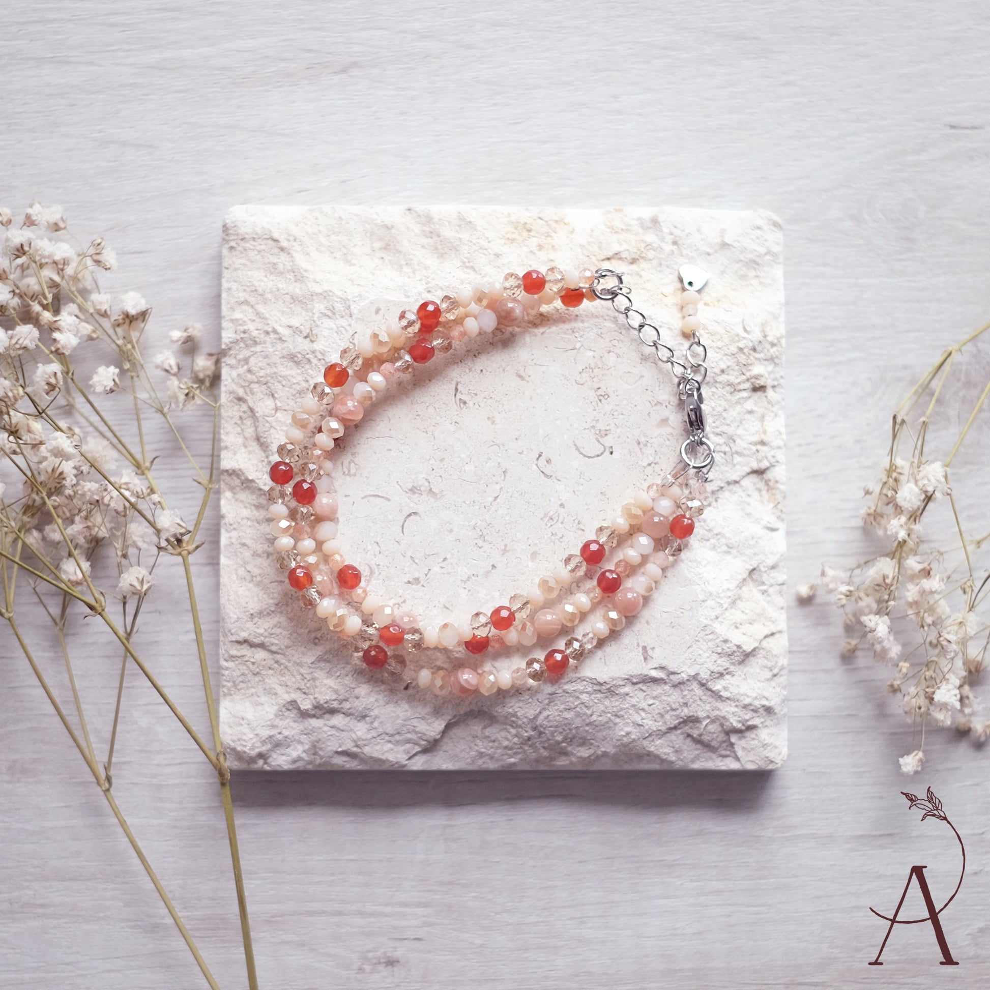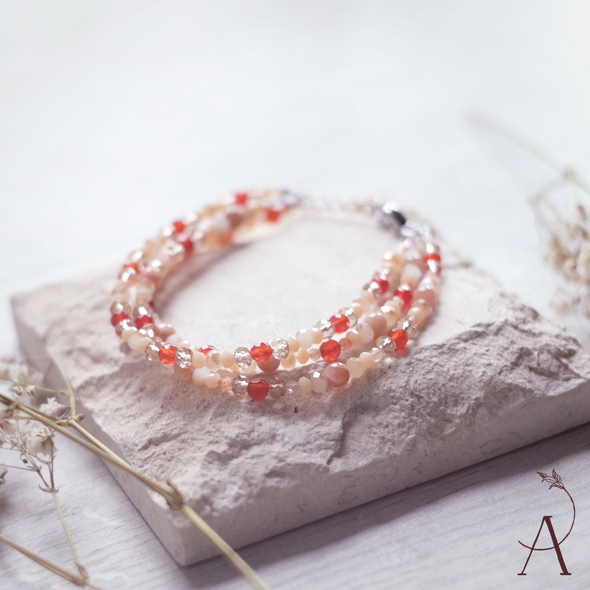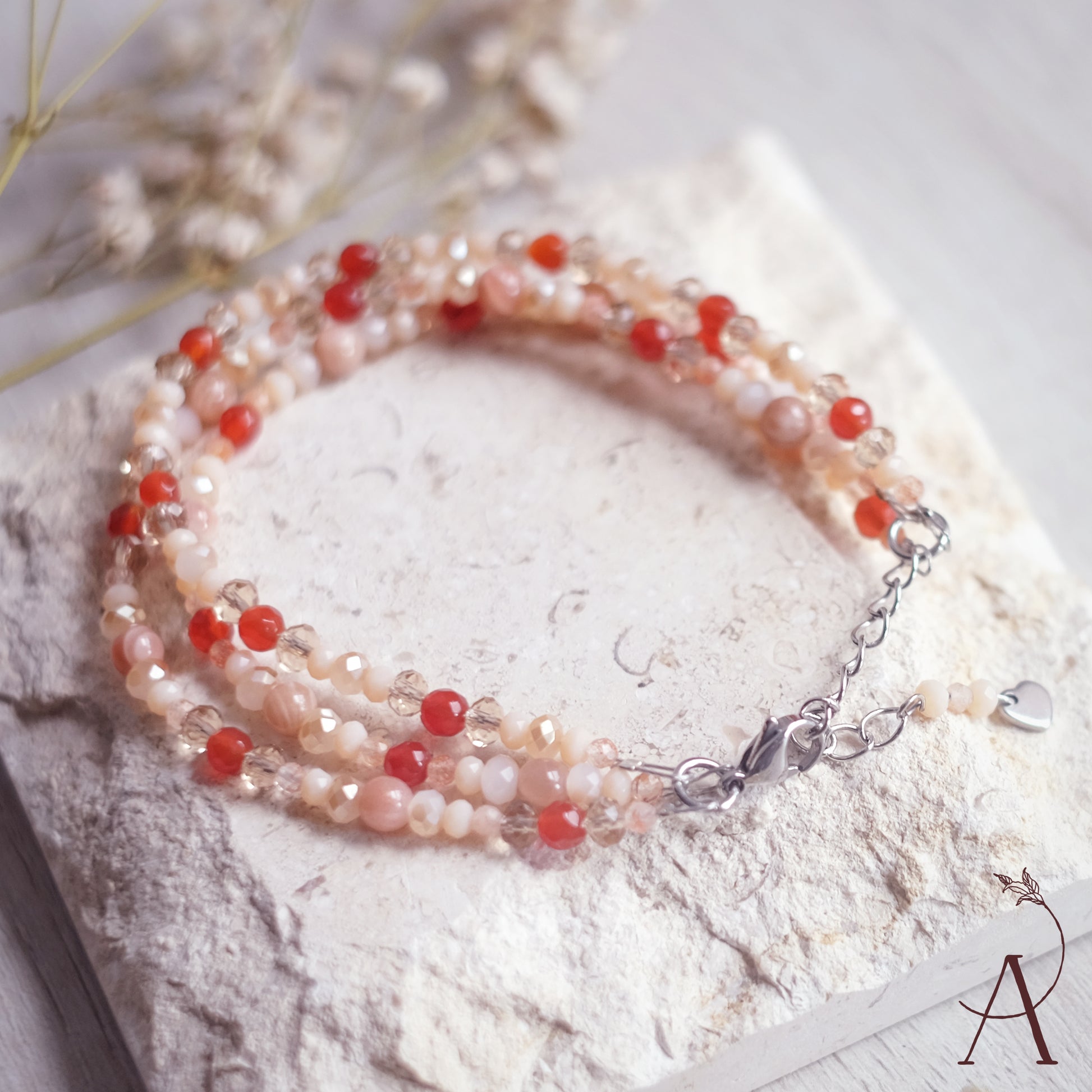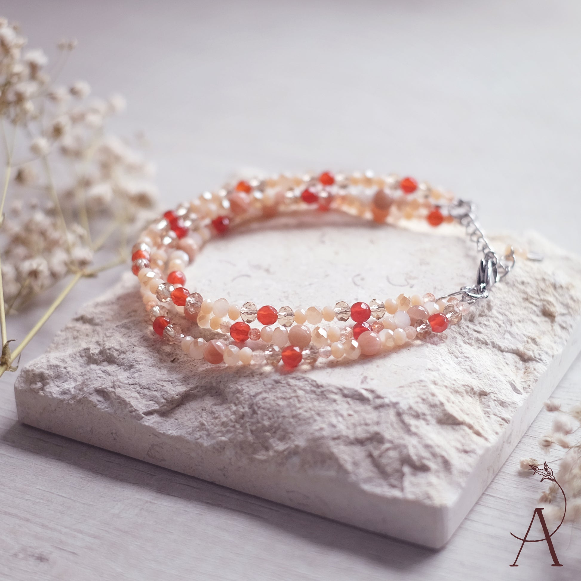 Fabriqué avec une chaîne réglable en acier inoxydable de couleur argentée. Le bracelet a une longueur totale de 18,5 cm et peut être ajusté jusqu'à 22,5 cm. Mélange de perles de verre, d'acier inoxydable et de pierres naturelles. Les pierres naturelles sont la pierre de soleil et la cornaline.