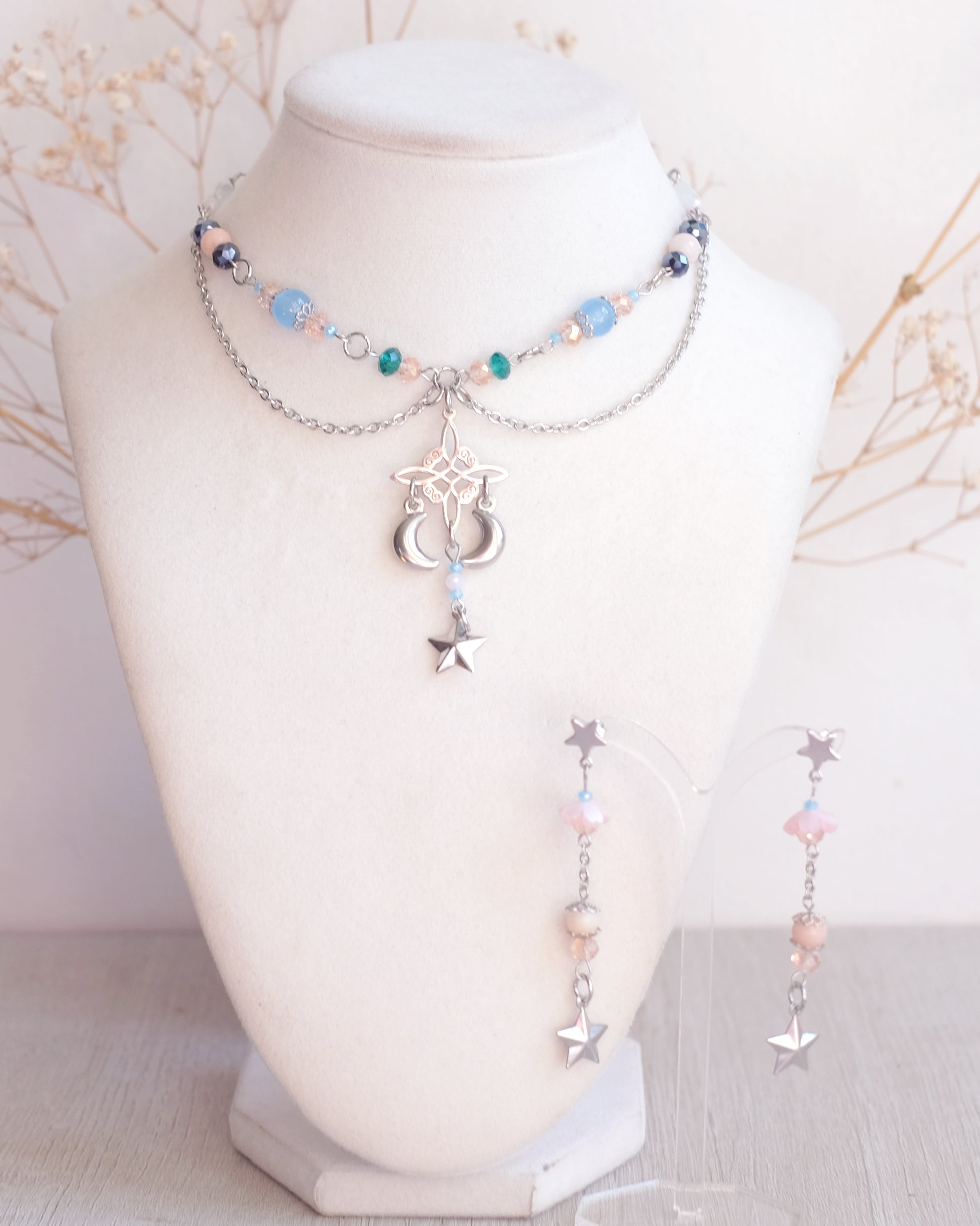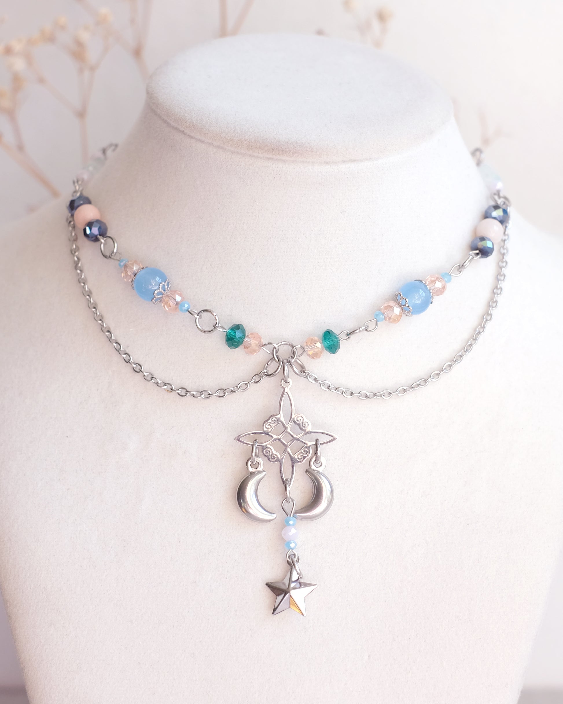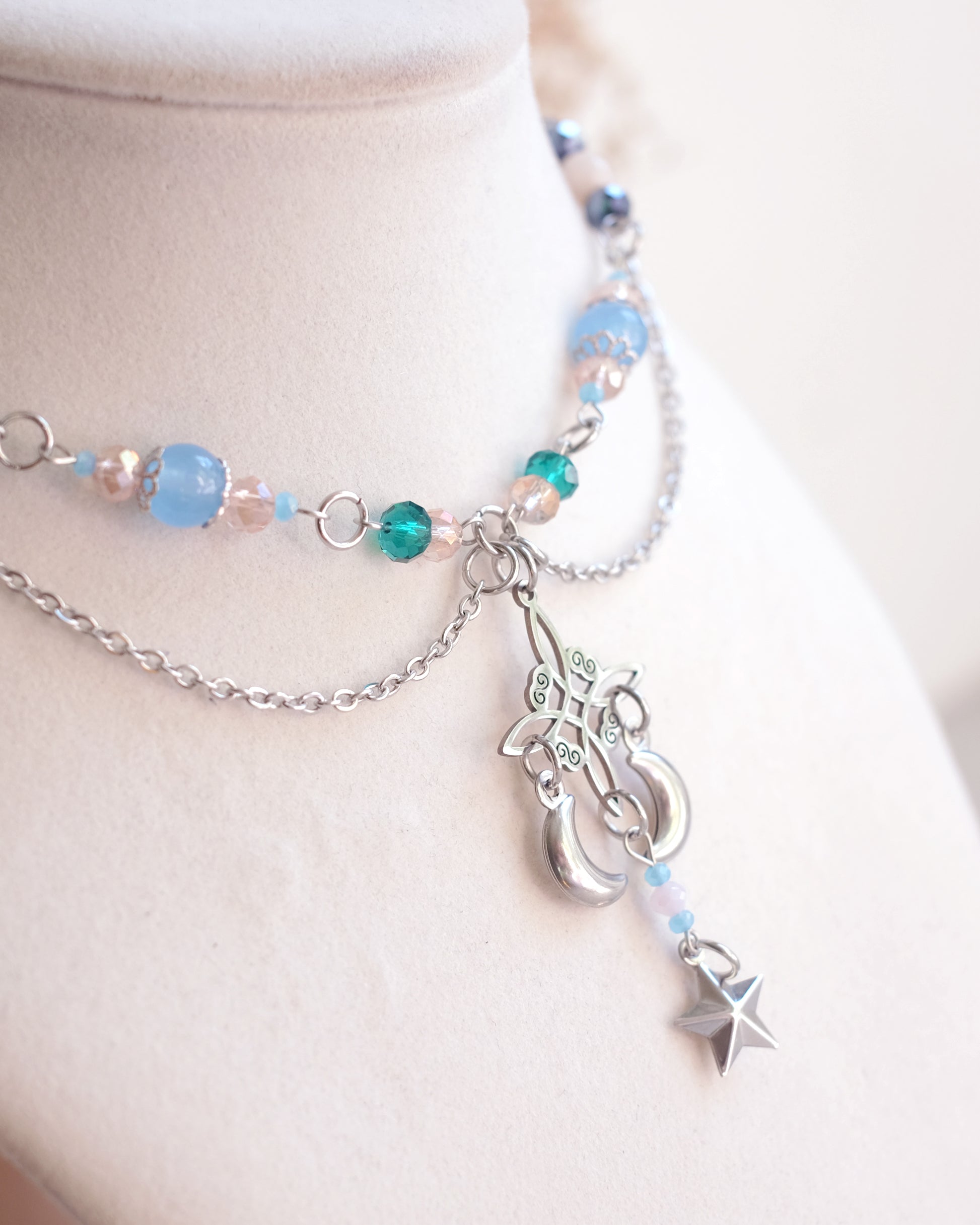 Ce collier en acier inoxydable marie des tons argentés scintillants à de douces nuances de rose et de bleu, combinant pierres naturelles et synthétiques en parfaite harmonie. Son pendentif, inspiré des pendules divinatoires, évoque un outil sacré utilisé pour se connecter à l’invisible. Orné de motifs lunaires et d’étoiles, il rappelle une carte céleste miniature posée contre la peau.