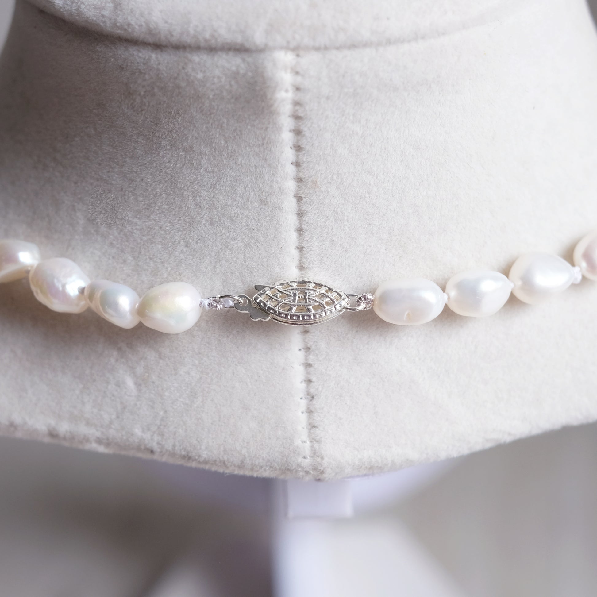 Le collier est fait de perles d’eau douce montées sur un fil de soie avec la technique traditionnelle et ancestrale des ‘‘nœuds’’. Sa longueur, une fois fermé, est d’environ 16,5 pouces. Le fermoir est en argent sterling. Les étoiles sont également faites de nâcre, comme les perles. Vérifiez bien la taille, car il n’est pas ajustable.