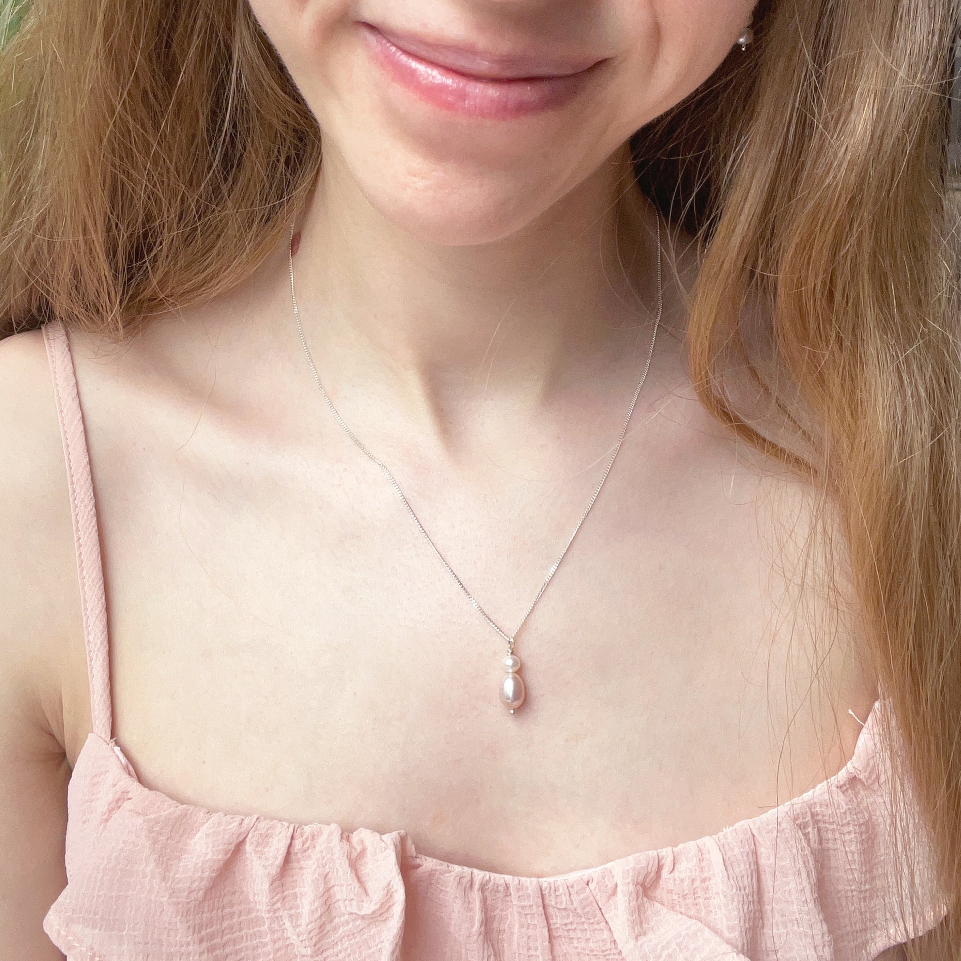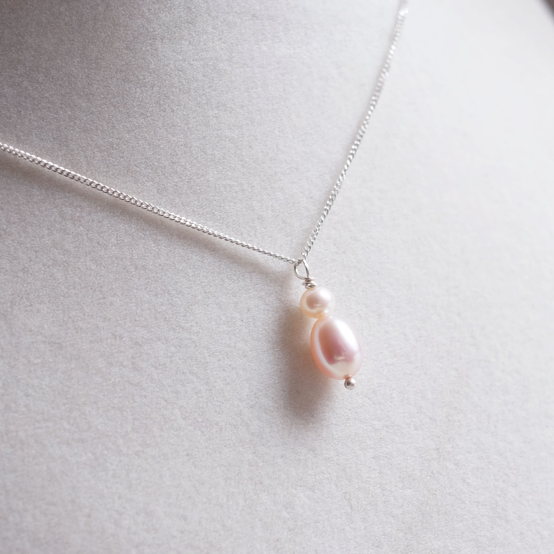 Collier en argent sterling composé d'une perle d'eau douce blanche ronde et une de forme ''poire'' rose poudré