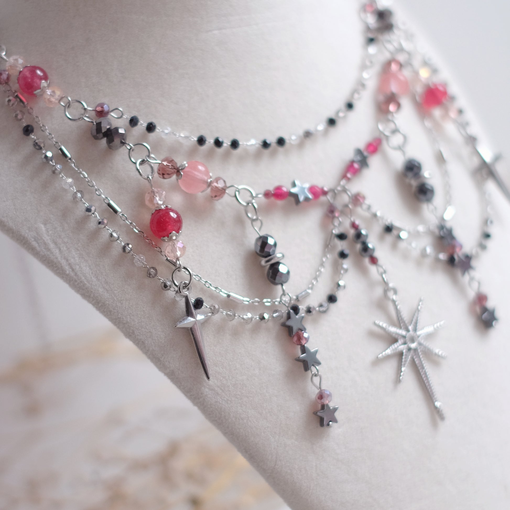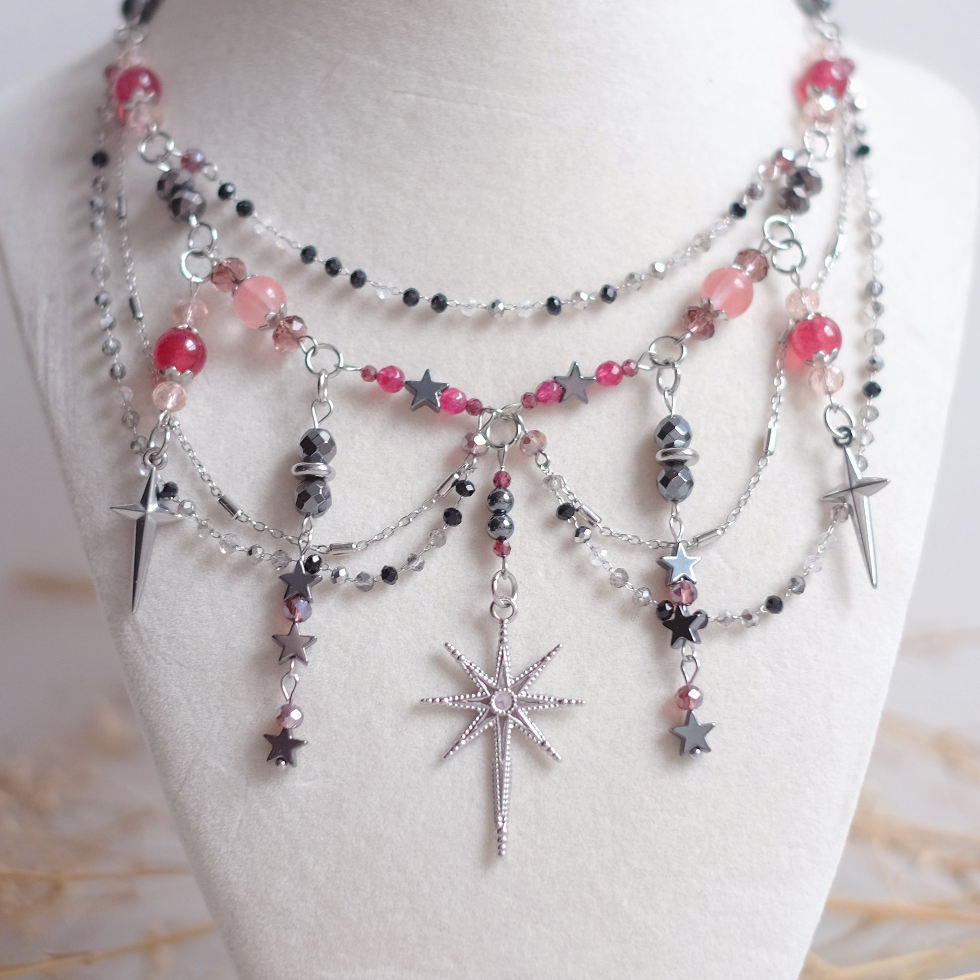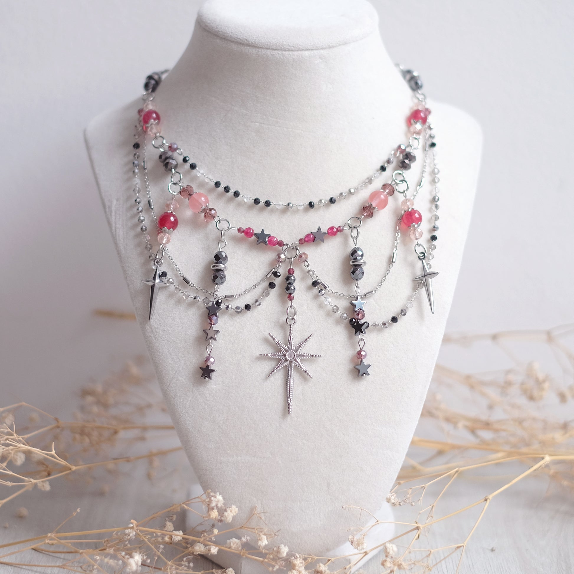 Plongez dans un univers mystique avec ce collier-parure aux teintes envoûtantes de rose, de noir et d'argent. Orné de délicats motifs d'étoiles célestes, il capture l’éclat des cieux nocturnes. Chaque détail scintille comme une poussière d’étoile, évoquant le charme éthéré et la magie. Un bijou envoûtant, parfait pour celles et ceux qui portent l’univers tout entier au creux de leur coeur.