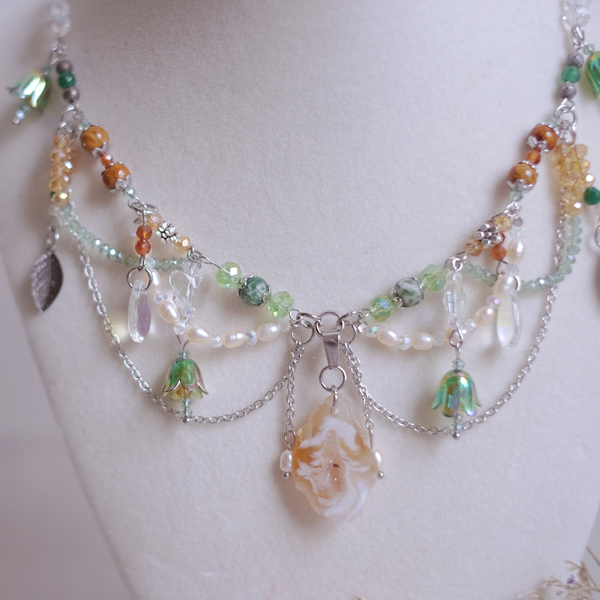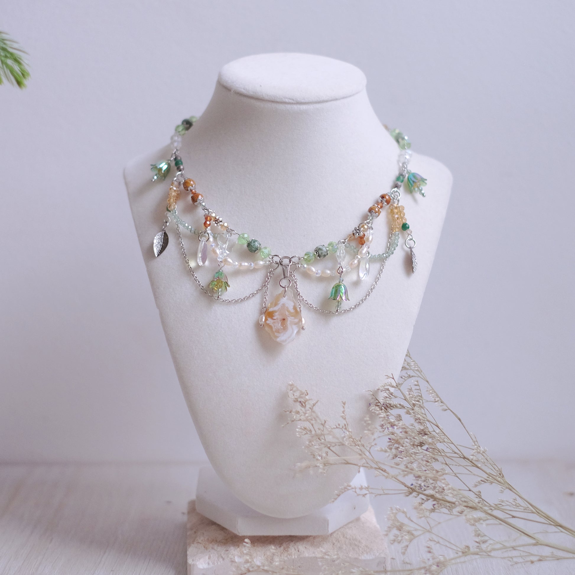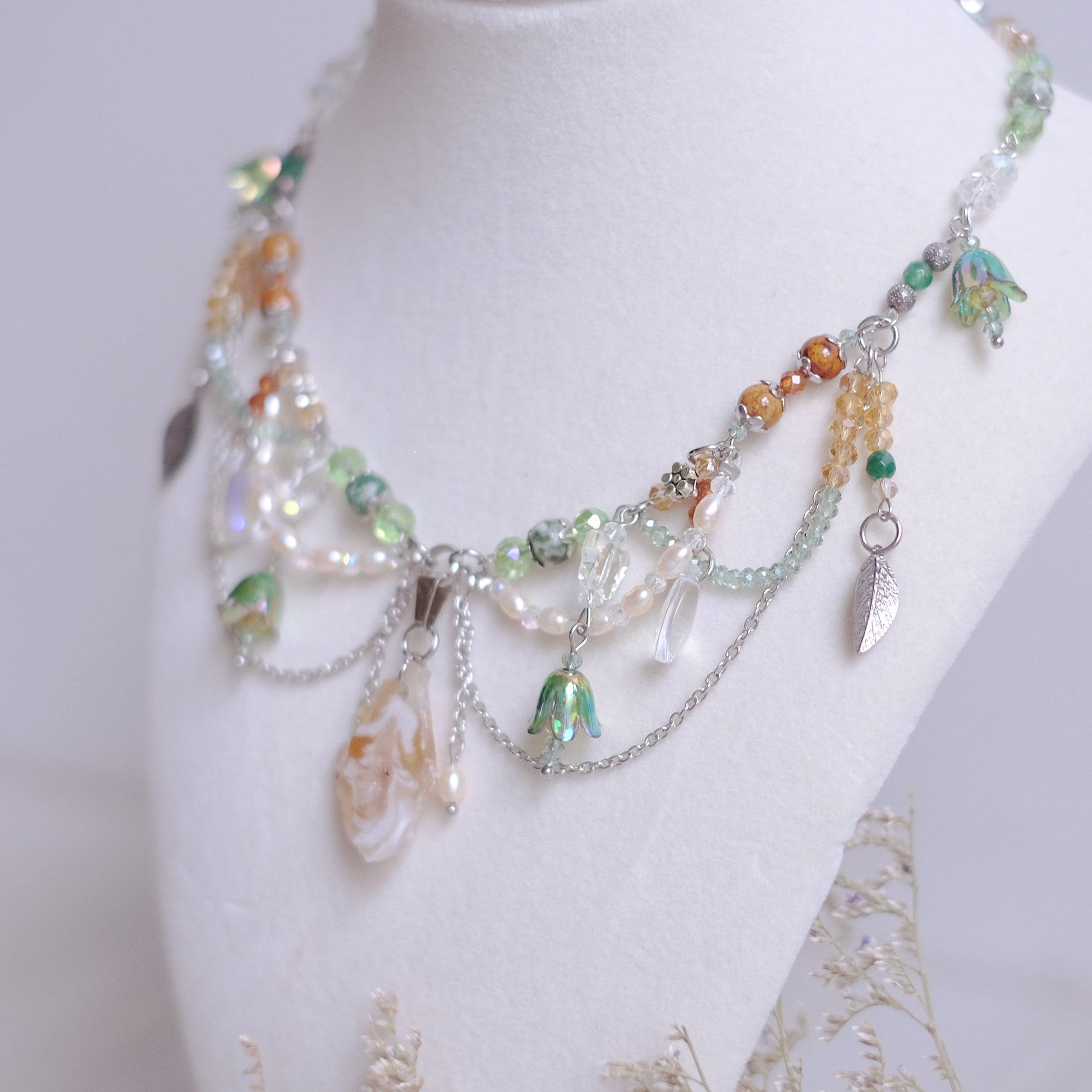 Plongez dans la magie d'une forêt enchantée avec notre collier en acier inoxydable argenté, soigneusement façonné à la main pour capturer l'éclat et la beauté de la nature. Ornées de perles de verre et de pierres naturelles de quartz, de fossile, d’agate mousse, de jade et de grenat, ainsi que de perles naturelles, ce collier évoque la fraîcheur et la splendeur d'une forêt luxuriante. Les délicates formes de feuilles, de gouttes de rosée du matin, de papillons et de fleurs transportent celui qui le porte dans un monde de rêve et d'émerveillement. Les nuances argentées, blanches, vertes et ambrées reflètent les teintes de la forêt, ajoutant une touche d'authenticité à ce bijou envoûtant. Ce collier, digne d'une fée de la forêt, incarne la beauté et la grâce de la nature, enveloppant celui qui le porte dans une aura magique et mystérieuse, digne des contes les plus enchanteurs.