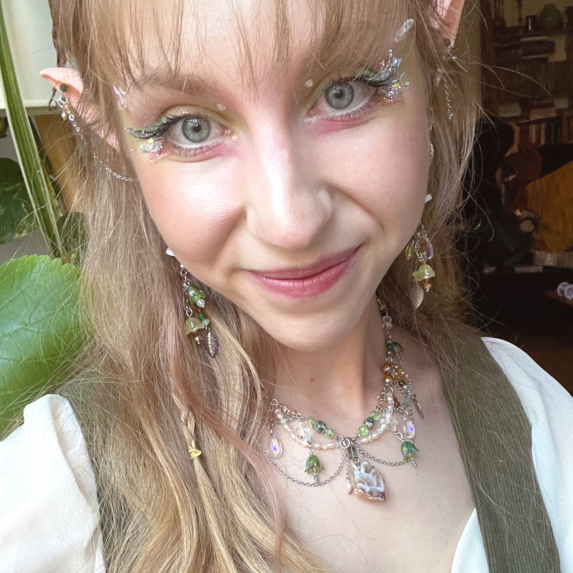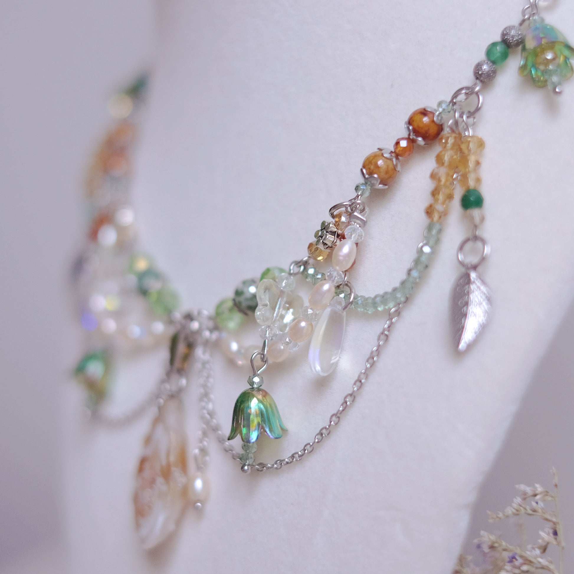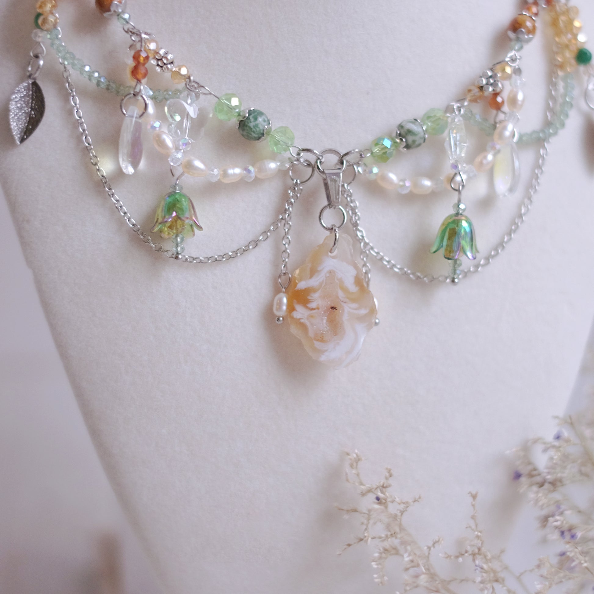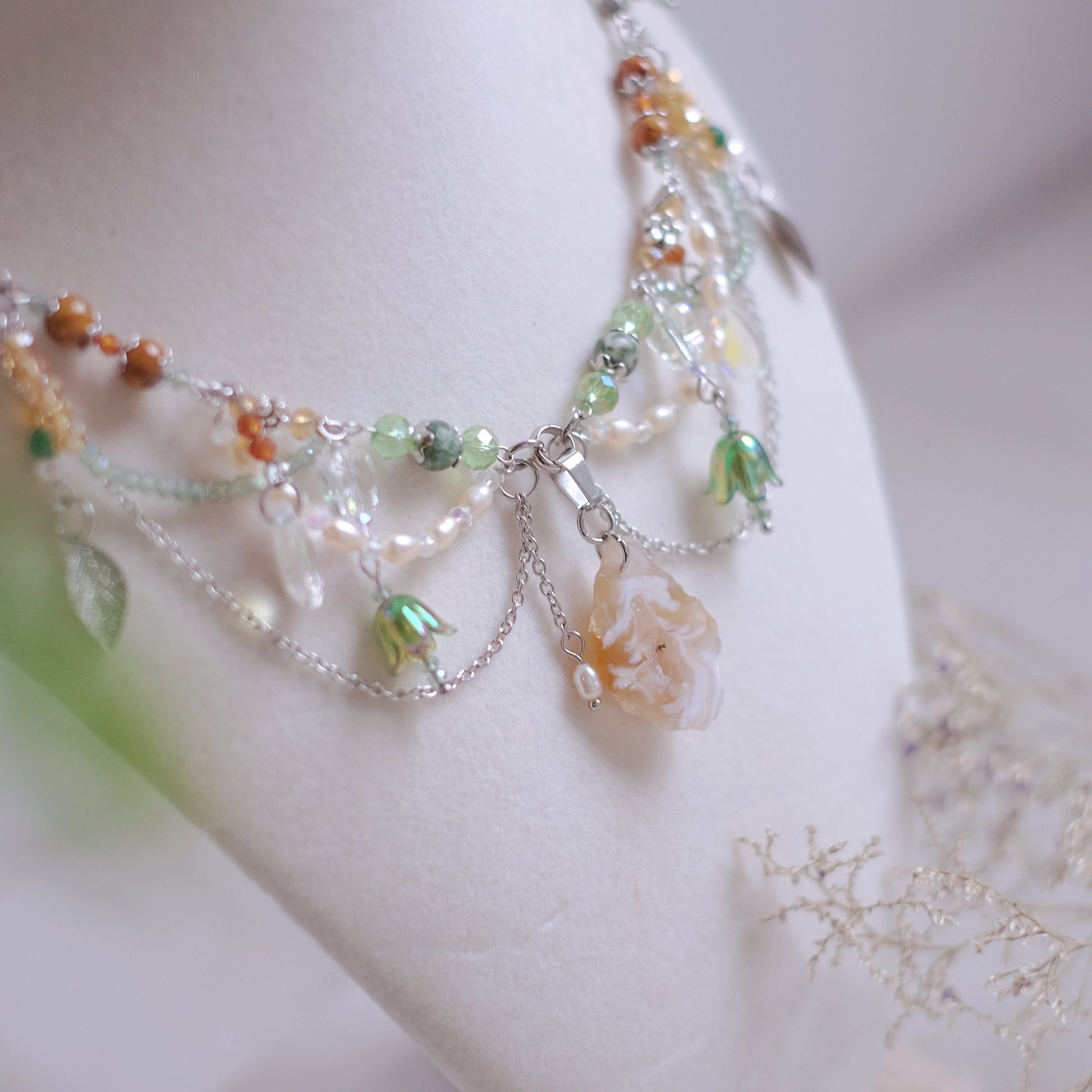 Plongez dans la magie d'une forêt enchantée avec notre collier en acier inoxydable argenté, soigneusement façonné à la main pour capturer l'éclat et la beauté de la nature. Ornées de perles de verre et de pierres naturelles de quartz, de fossile, d’agate mousse, de jade et de grenat, ainsi que de perles naturelles, ce collier évoque la fraîcheur et la splendeur d'une forêt luxuriante. Les délicates formes de feuilles, de gouttes de rosée du matin, de papillons et de fleurs transportent celui qui le porte dans un monde de rêve et d'émerveillement. Les nuances argentées, blanches, vertes et ambrées reflètent les teintes de la forêt, ajoutant une touche d'authenticité à ce bijou envoûtant. Ce collier, digne d'une fée de la forêt, incarne la beauté et la grâce de la nature, enveloppant celui qui le porte dans une aura magique et mystérieuse, digne des contes les plus enchanteurs.