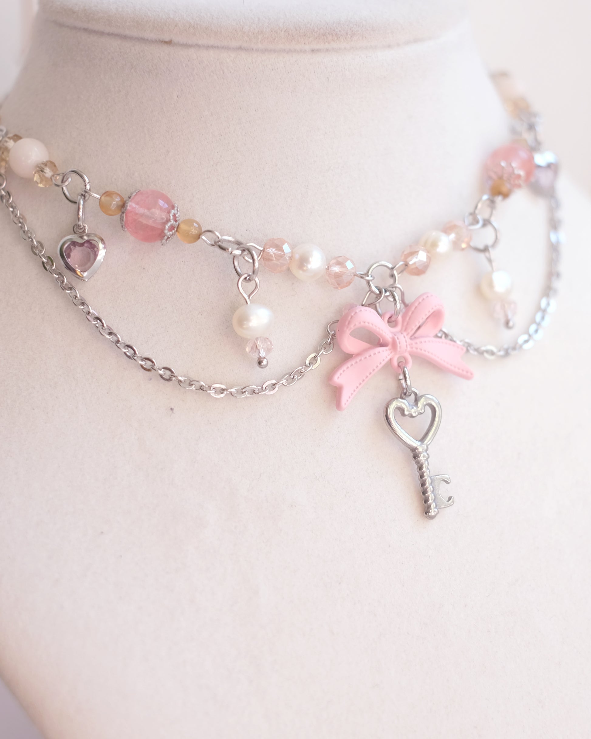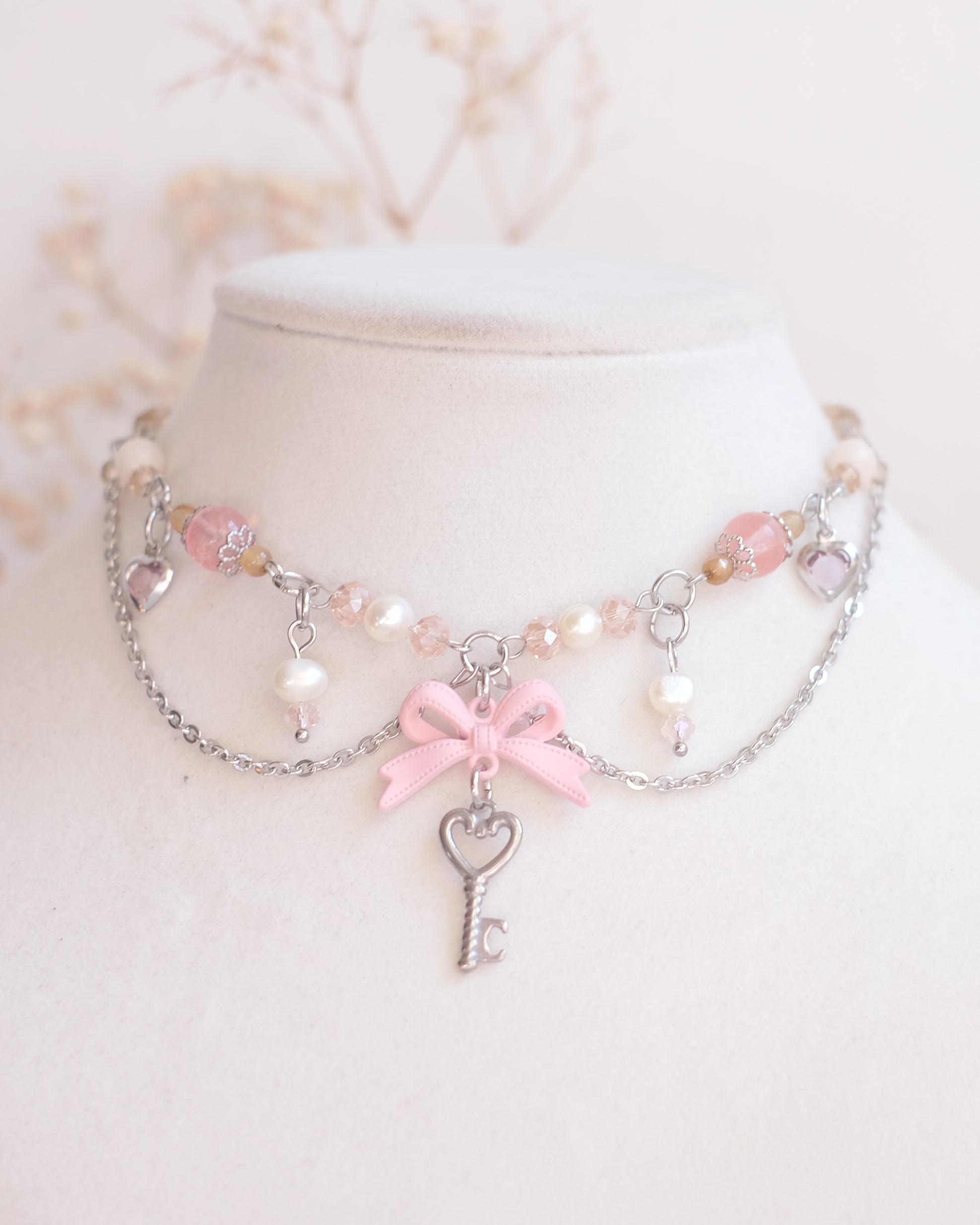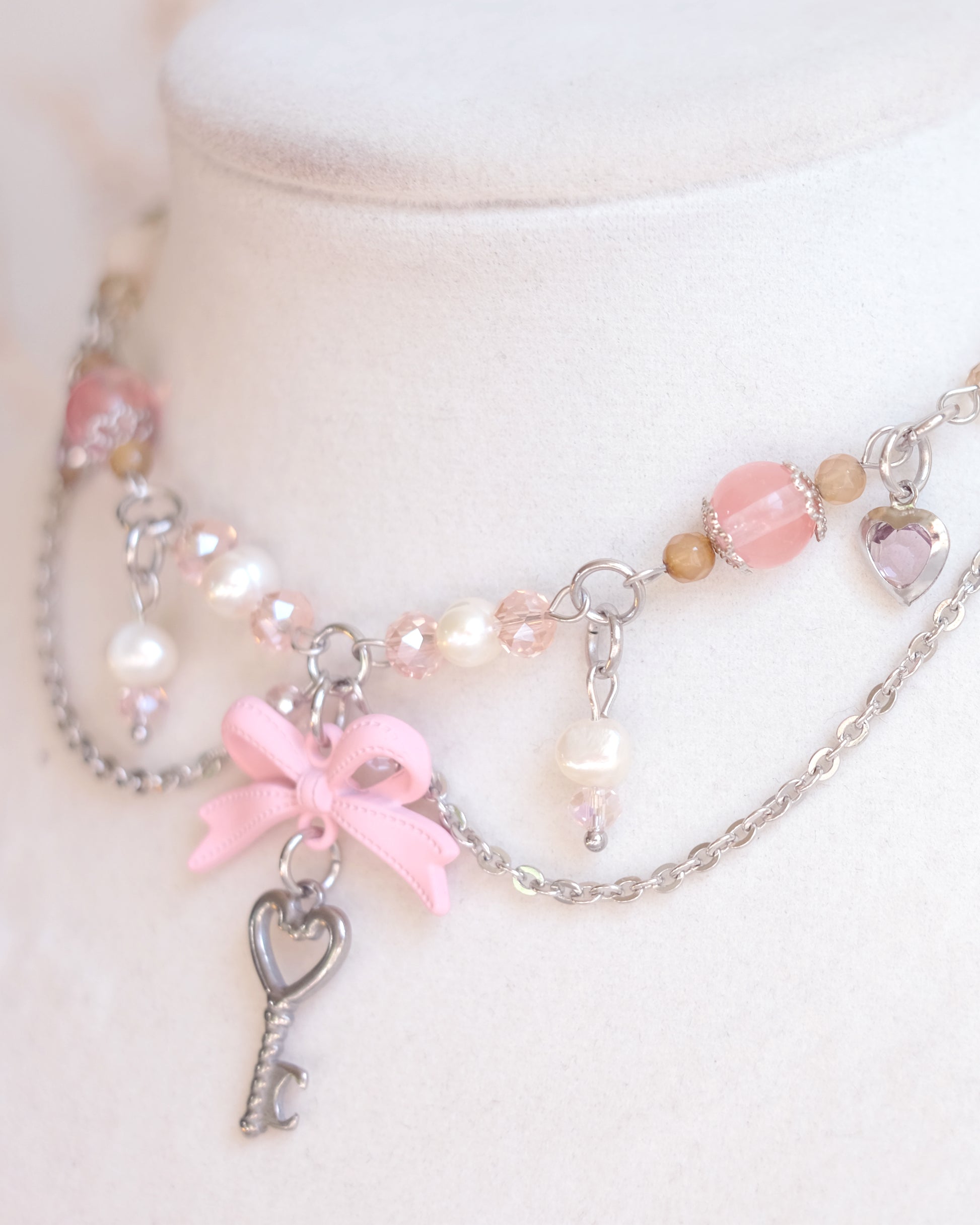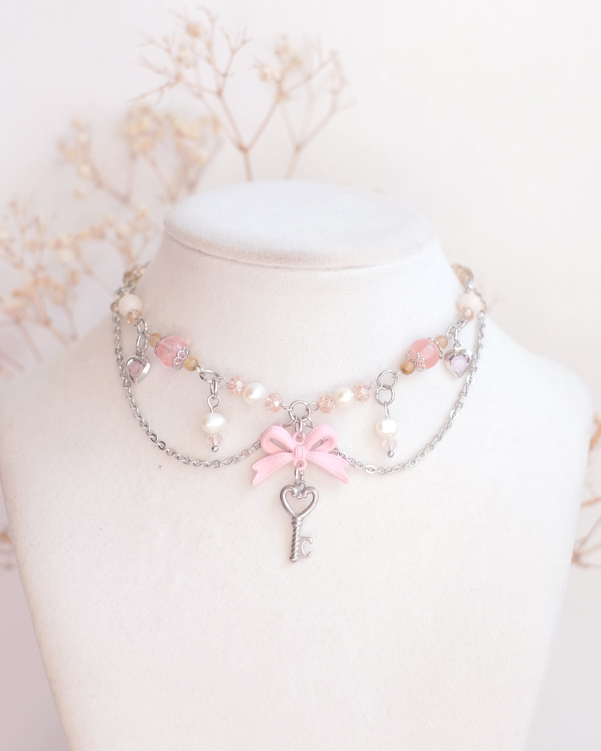 Ce délicat collier ras-du-cou en acier inoxydable marie la douceur des perles naturelles à l’éclat des pierres et des perles de verre chatoyantes. Ses teintes tendres — rose, blanc et argent — évoquent un univers de poésie et de délicatesse. Orné d’une fine boucle et d’une petite clé mystérieuse, il fait penser à un trésor caché, un jardin secret ou une boîte à souvenirs.