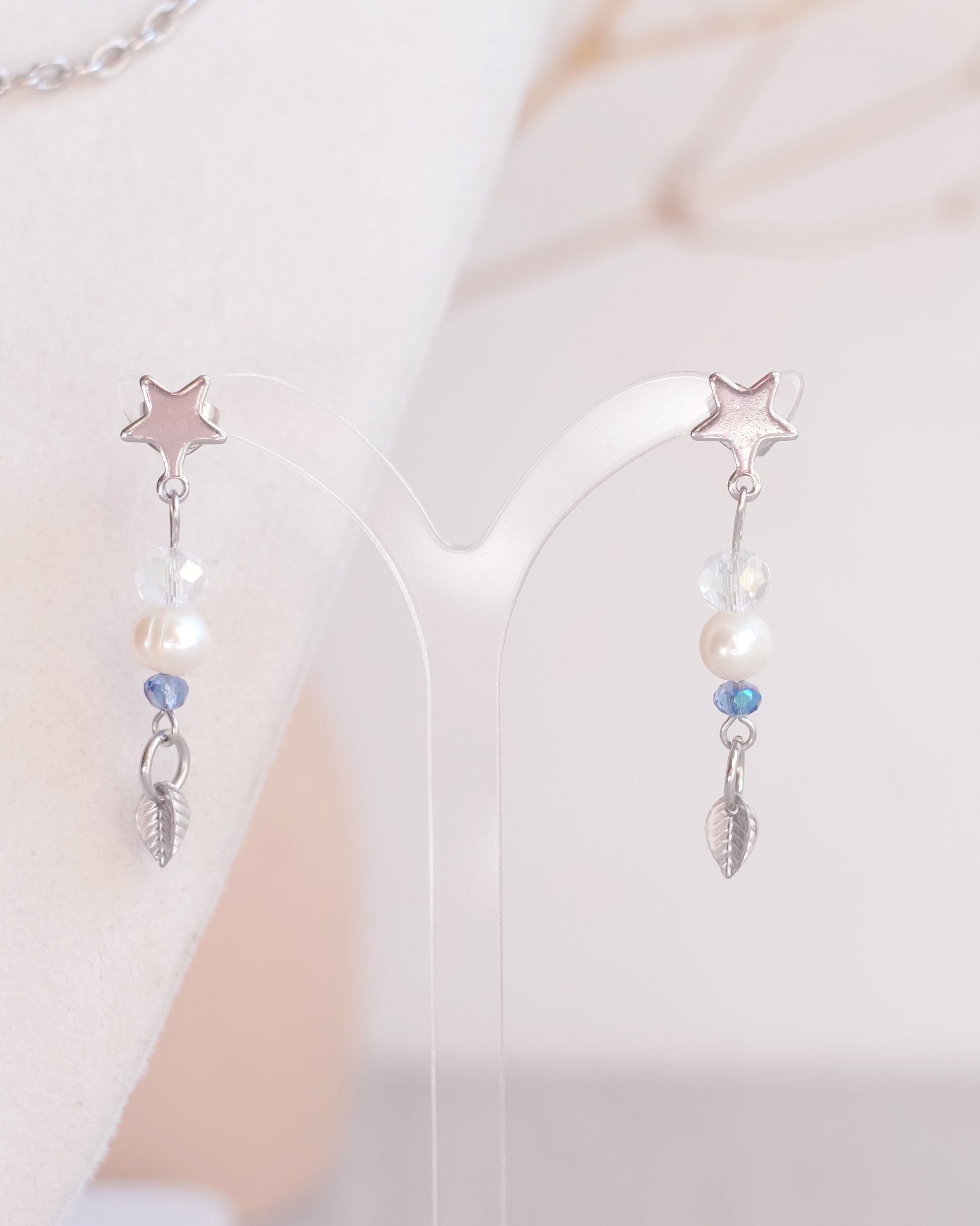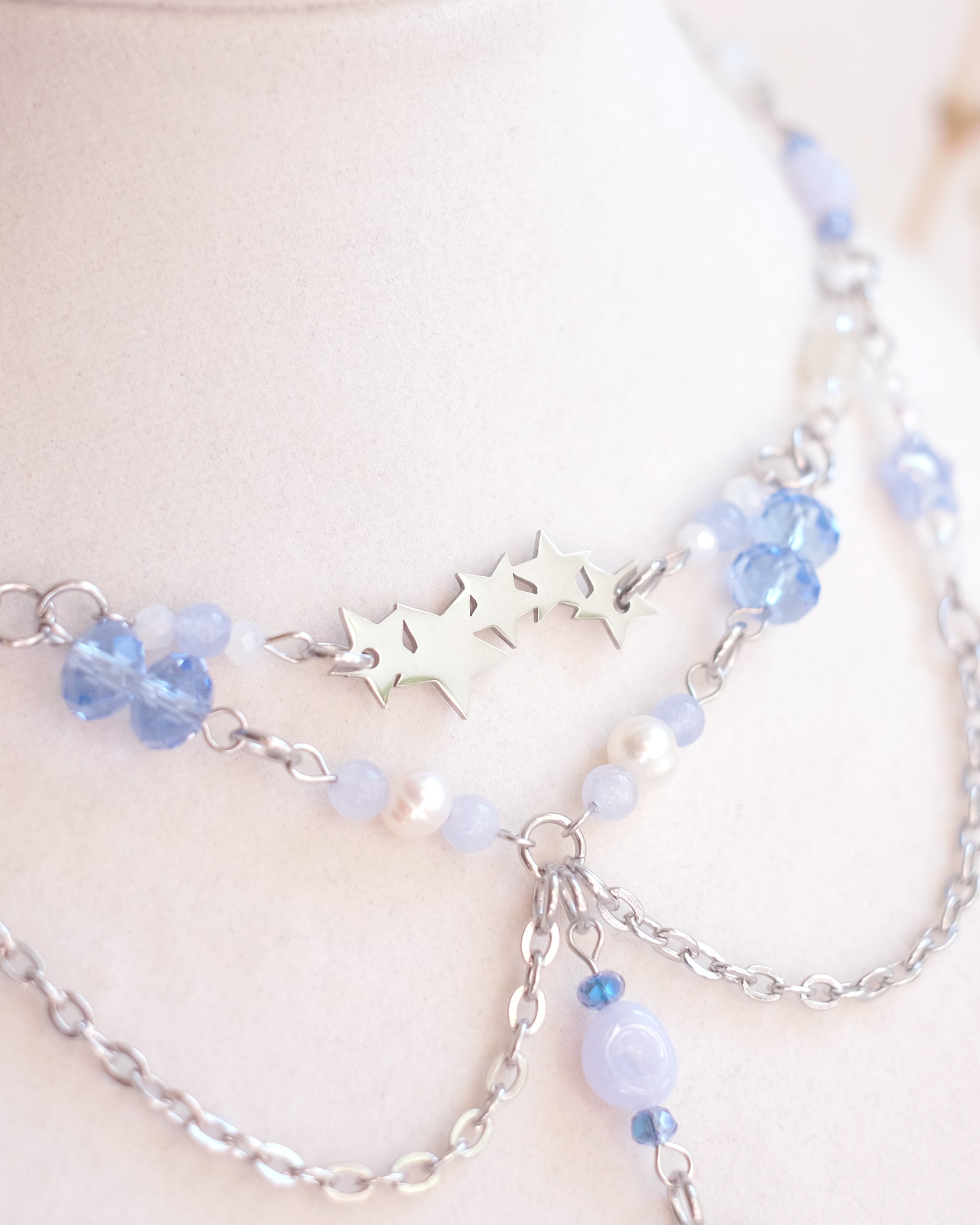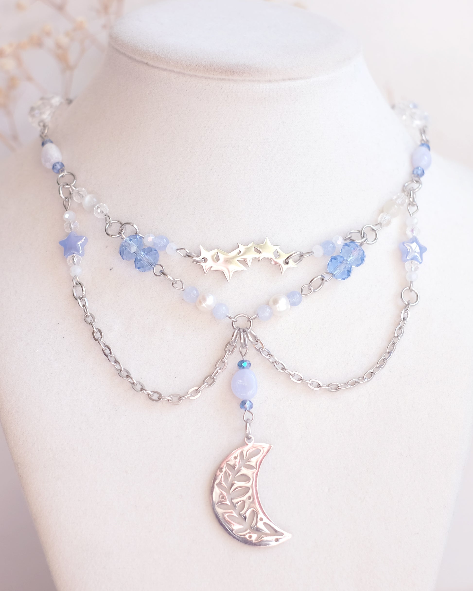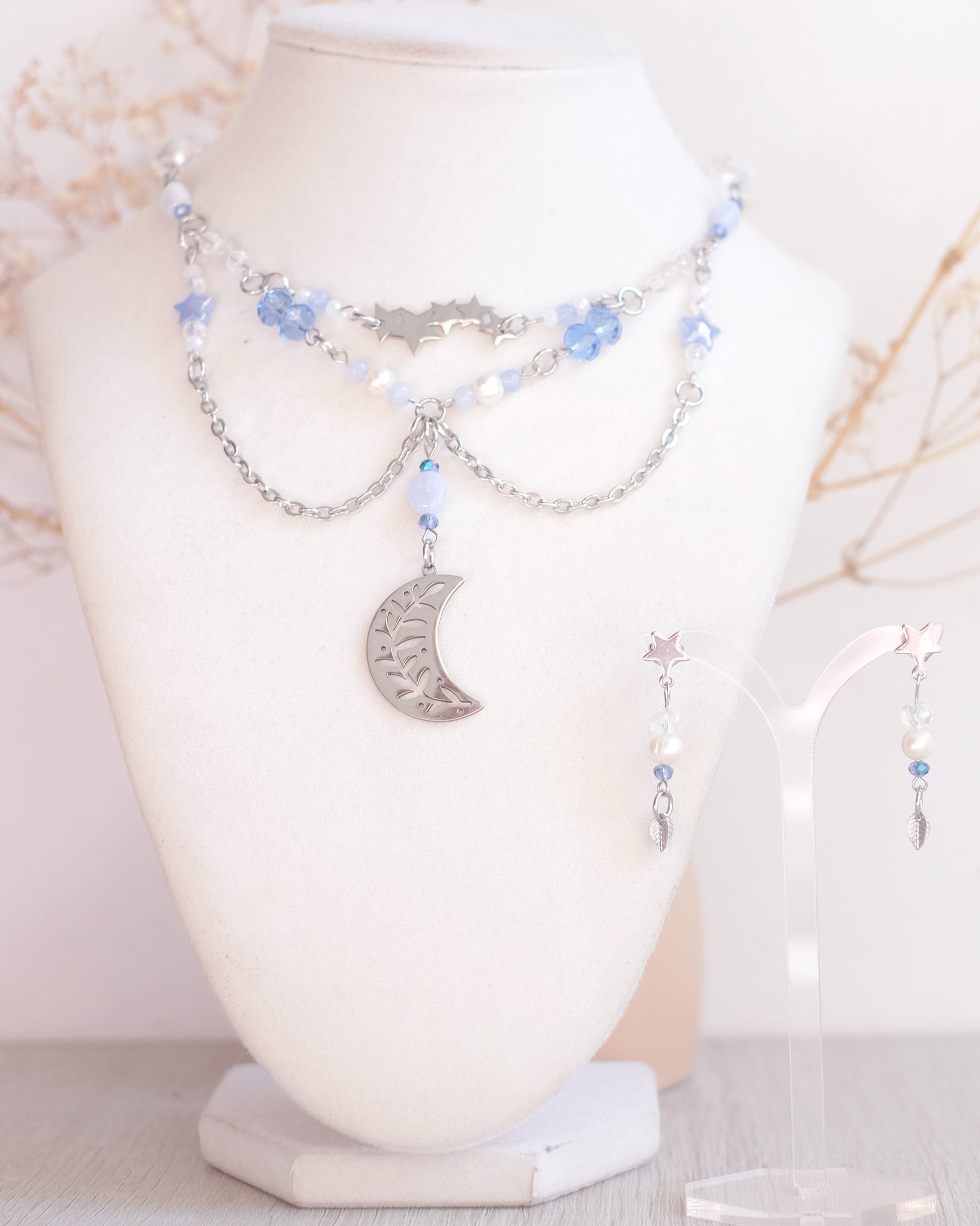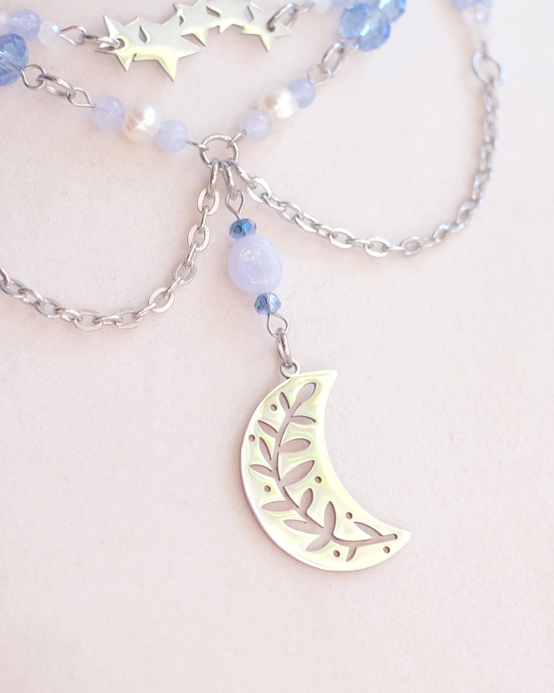 Ce collier en acier inoxydable marie pierres naturelles et synthétiques dans une palette lumineuse de bleu pâle, blanc et argent, évoquant une brume nocturne qui adoucit doucement l’obscurité.