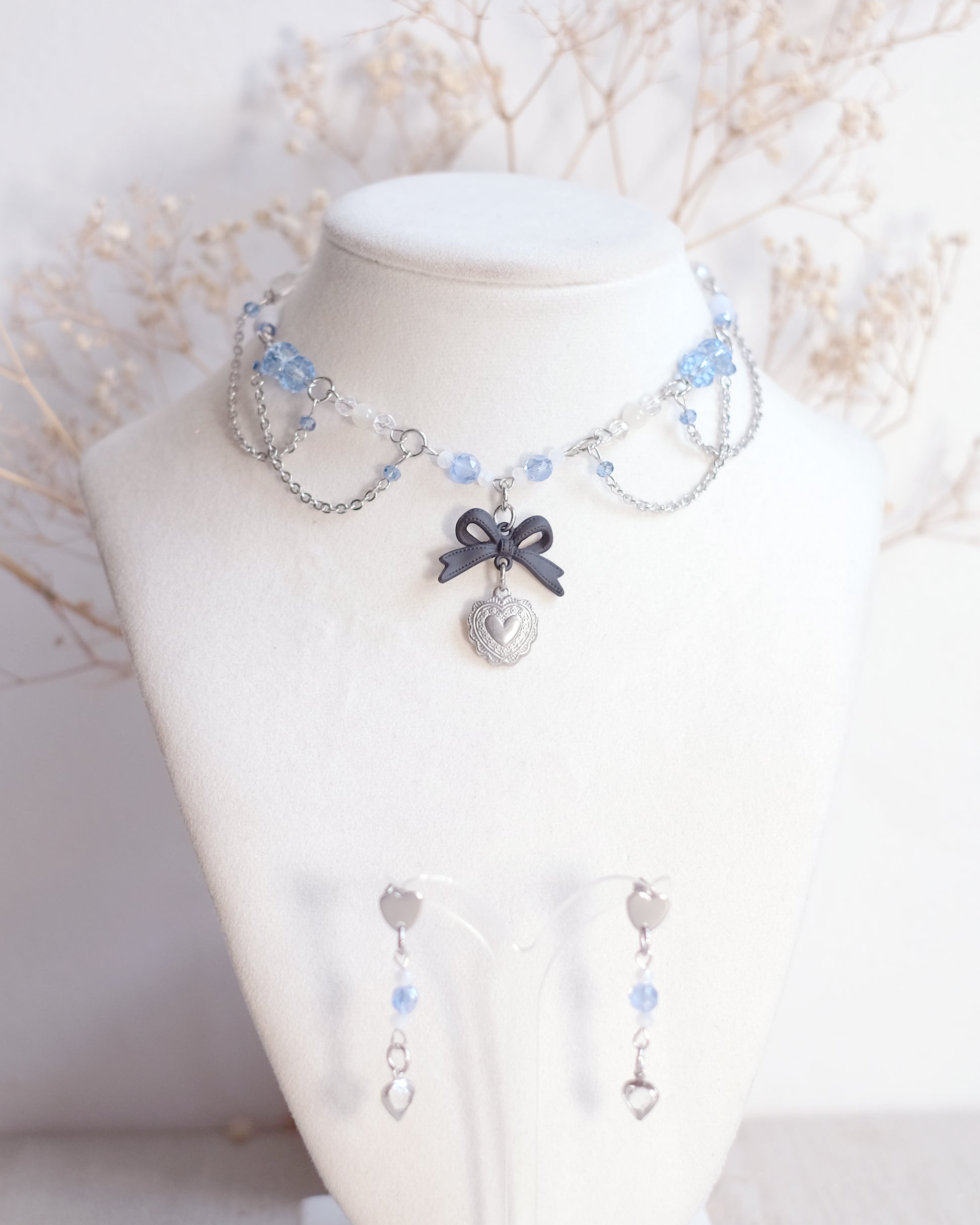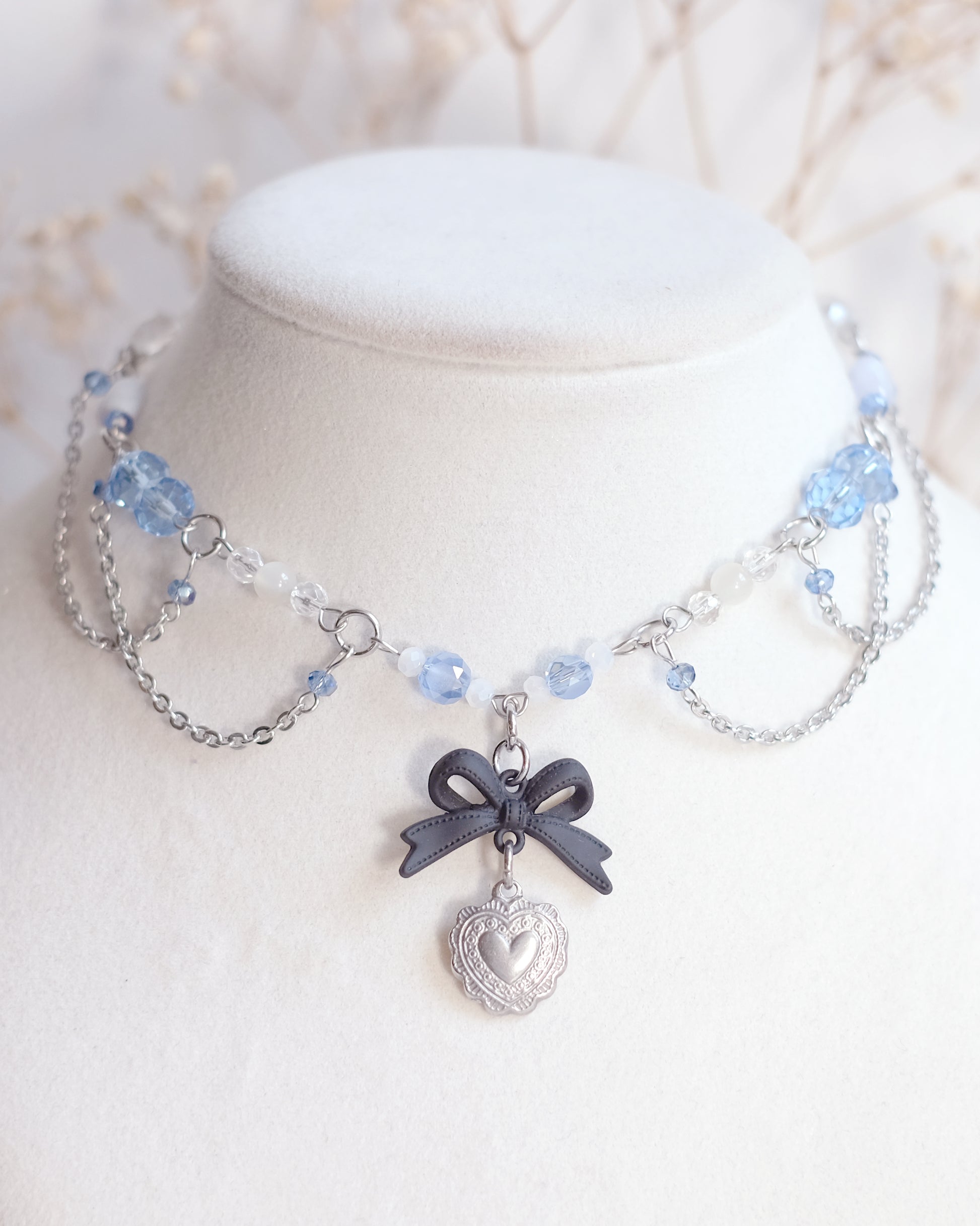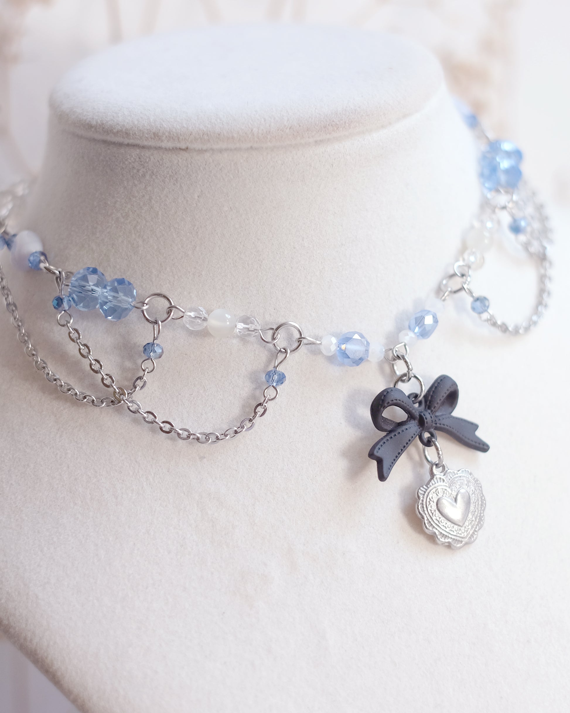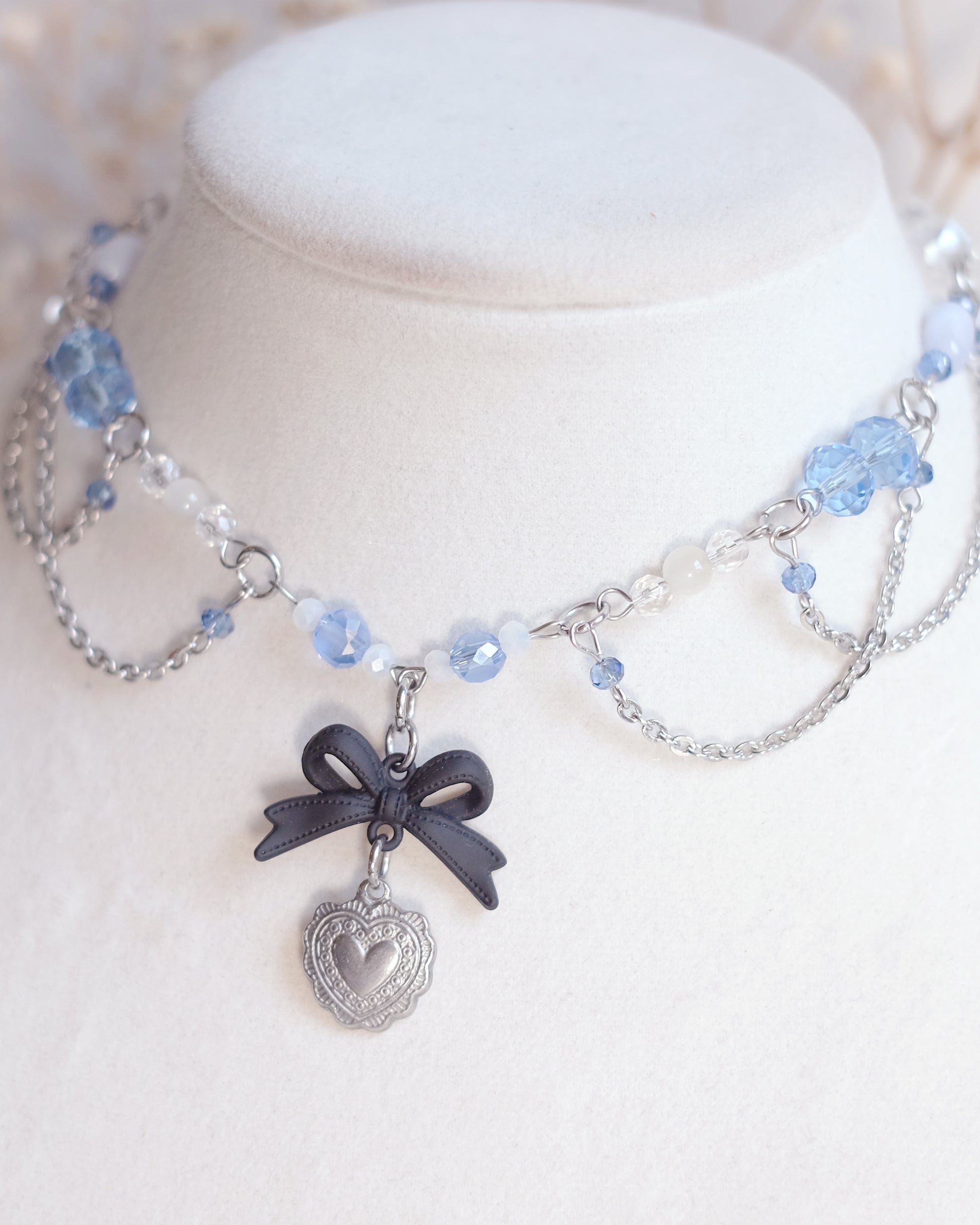 Douceur, tendresse, nuances bleues et cristallines — ce collier ras-du-cou évoque une légèreté angélique et un amour précieux.