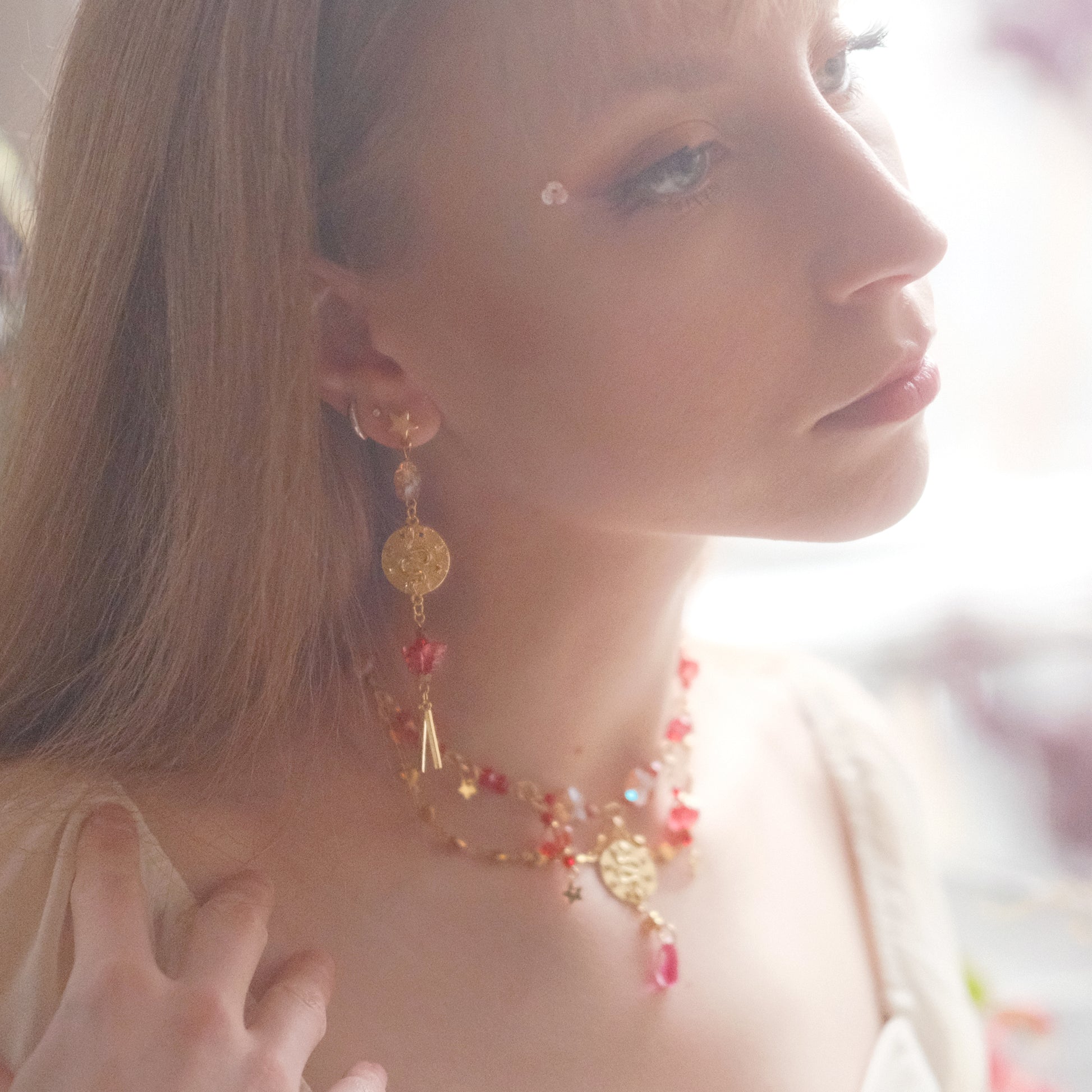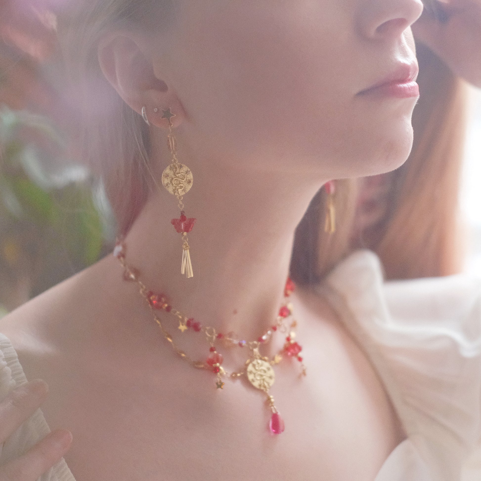 These one-of-a-kind earrings celebrate the joy and energy of festive warm tones — perfect for adding a touch of elegance to any outfit. With golden accents and a deep red hue, they evoke luck, happiness, and prosperity.