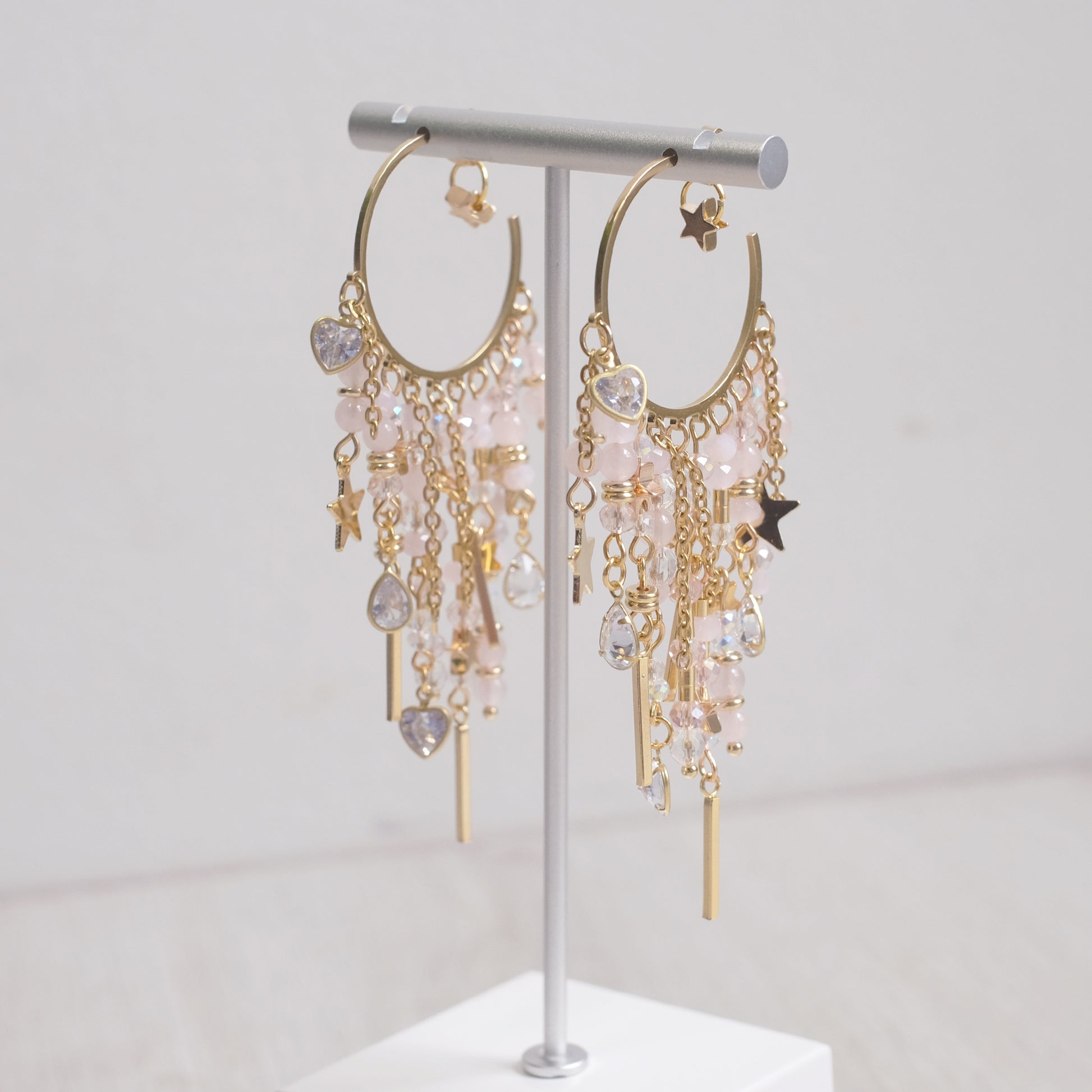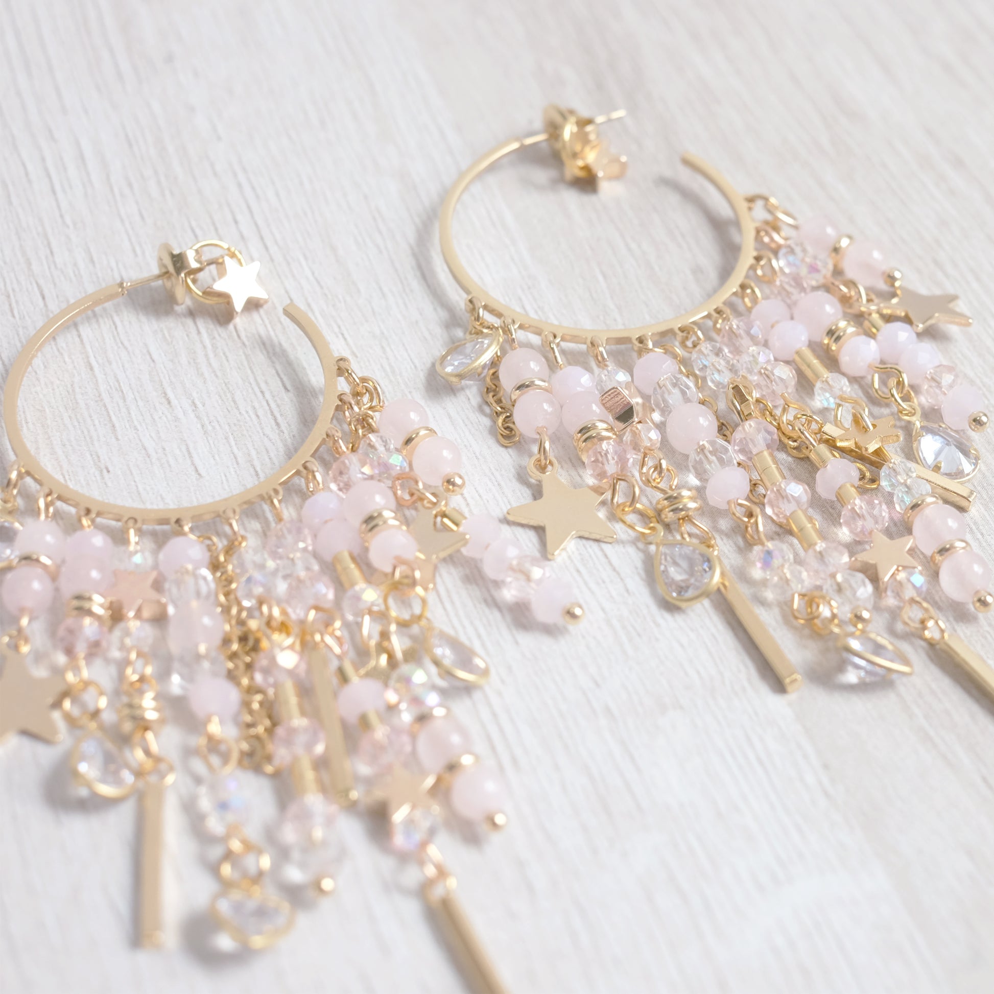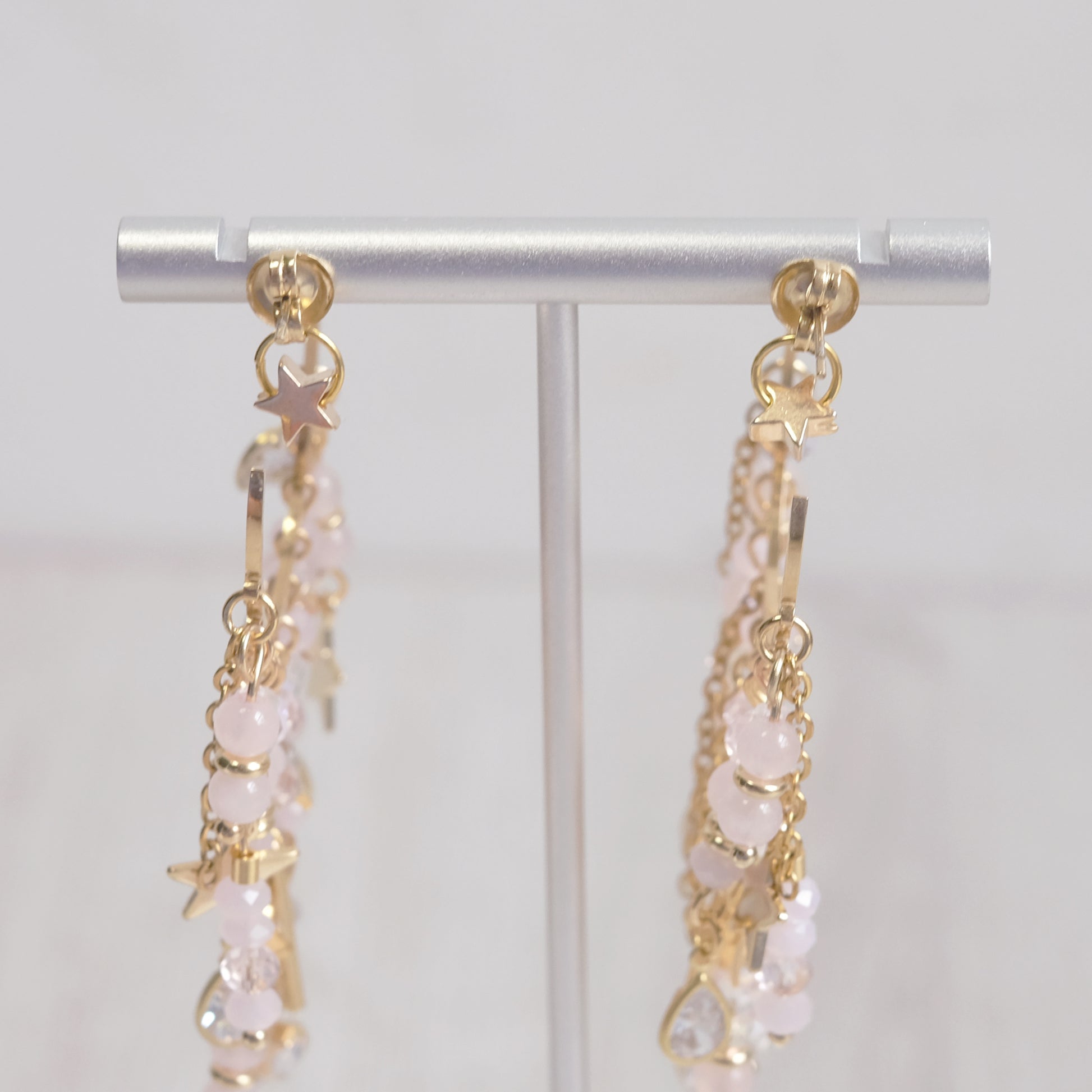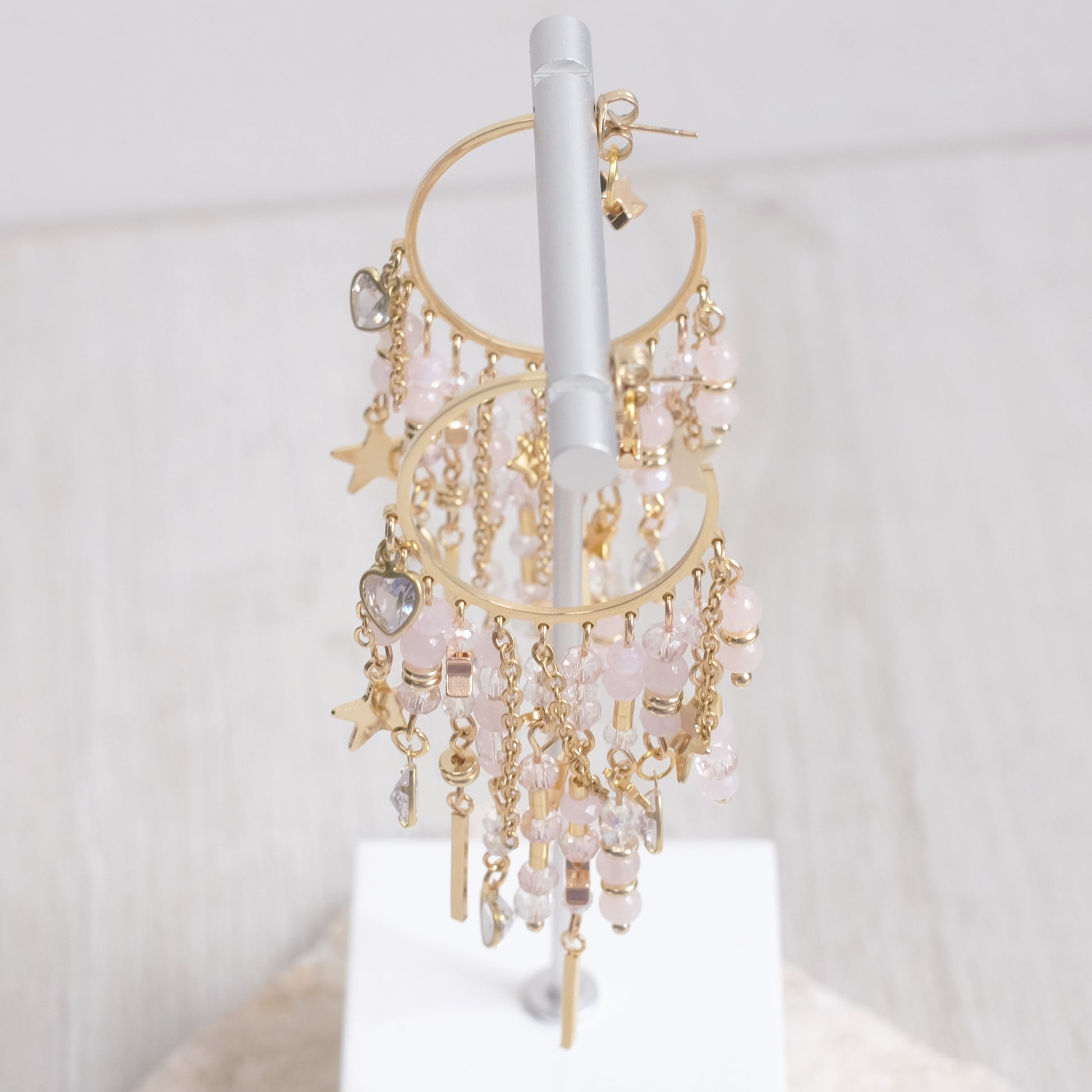 Crafted in gold-colored stainless steel, these earrings combine glass beads, stainless steel, and natural stones.