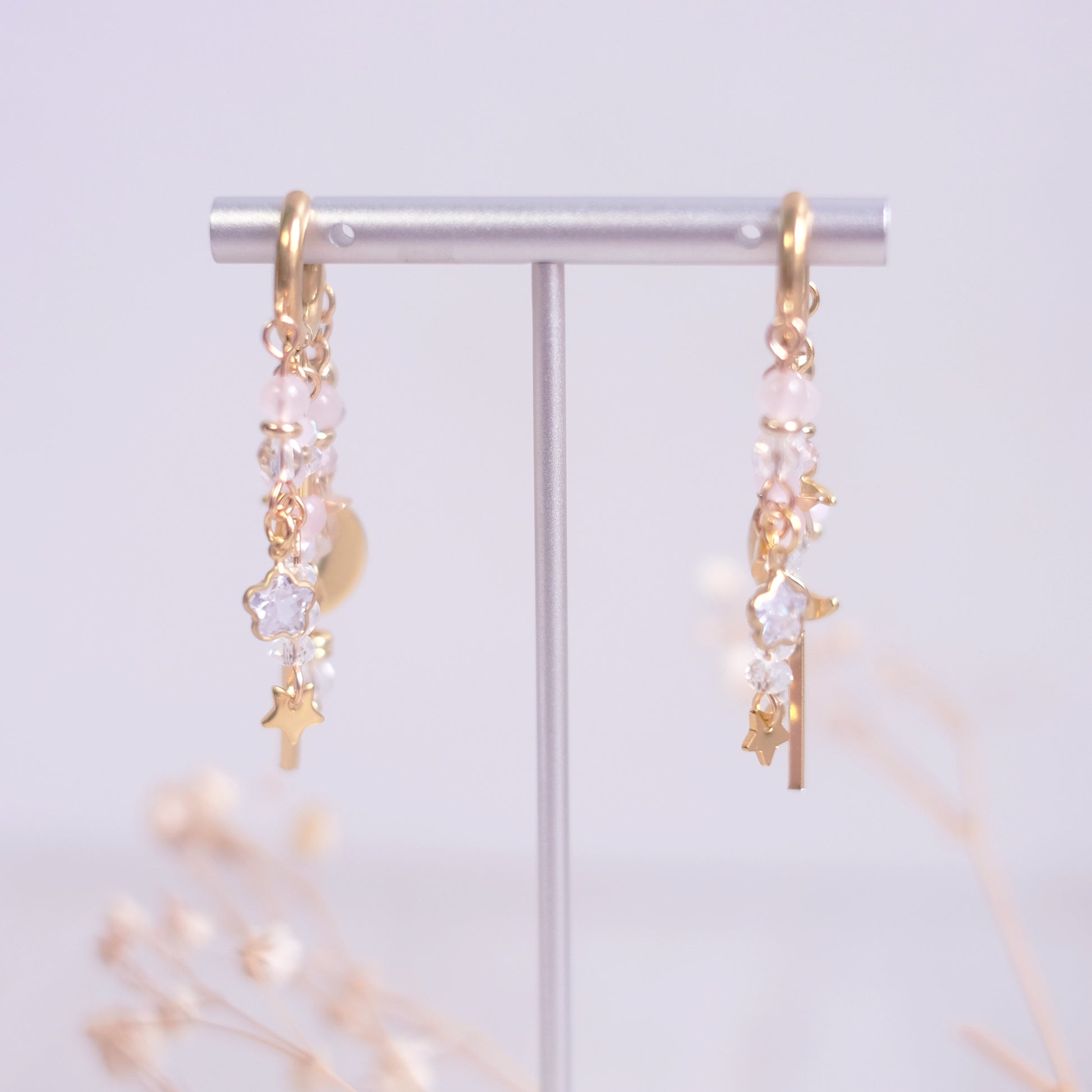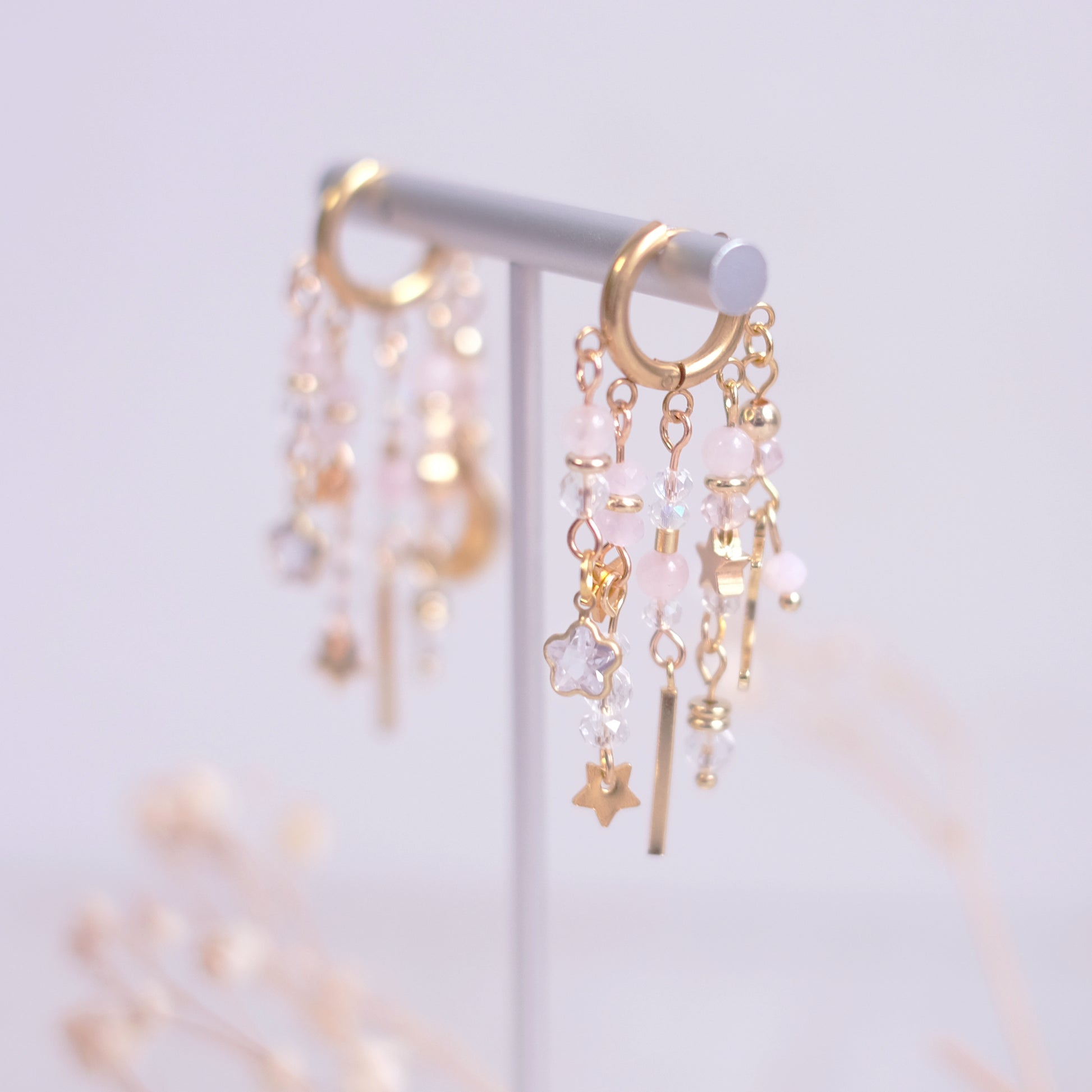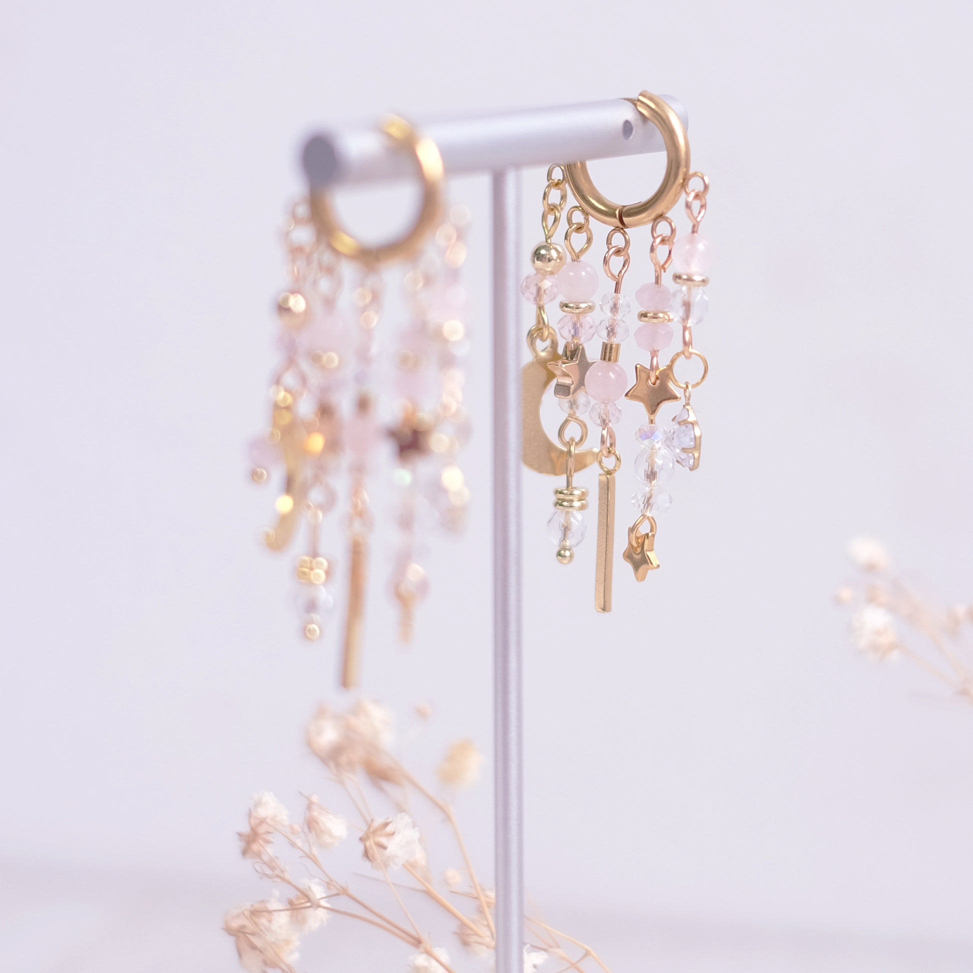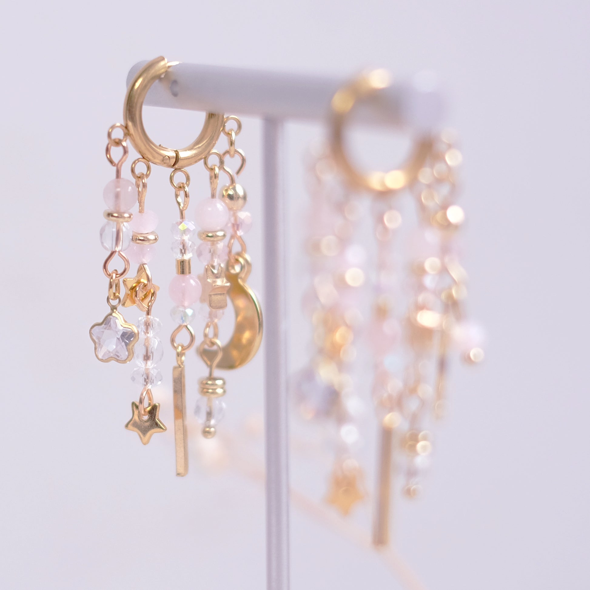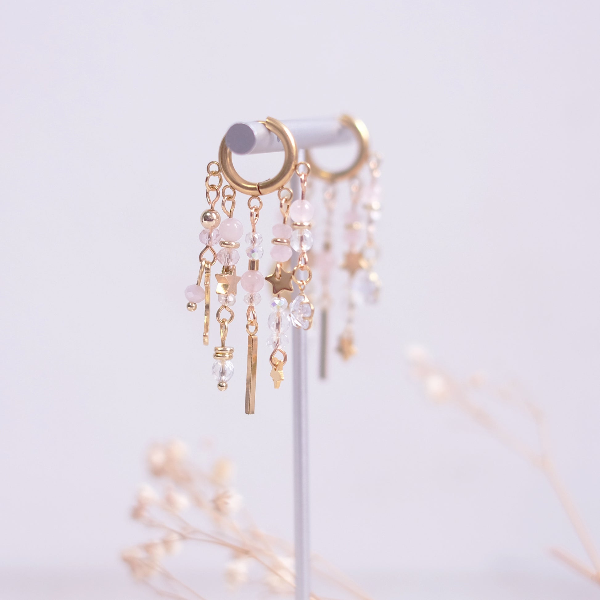 Made from gold-colored stainless steel, these earrings combine glass beads, stainless steel, and natural stones — featuring both rose quartz and clear quartz.