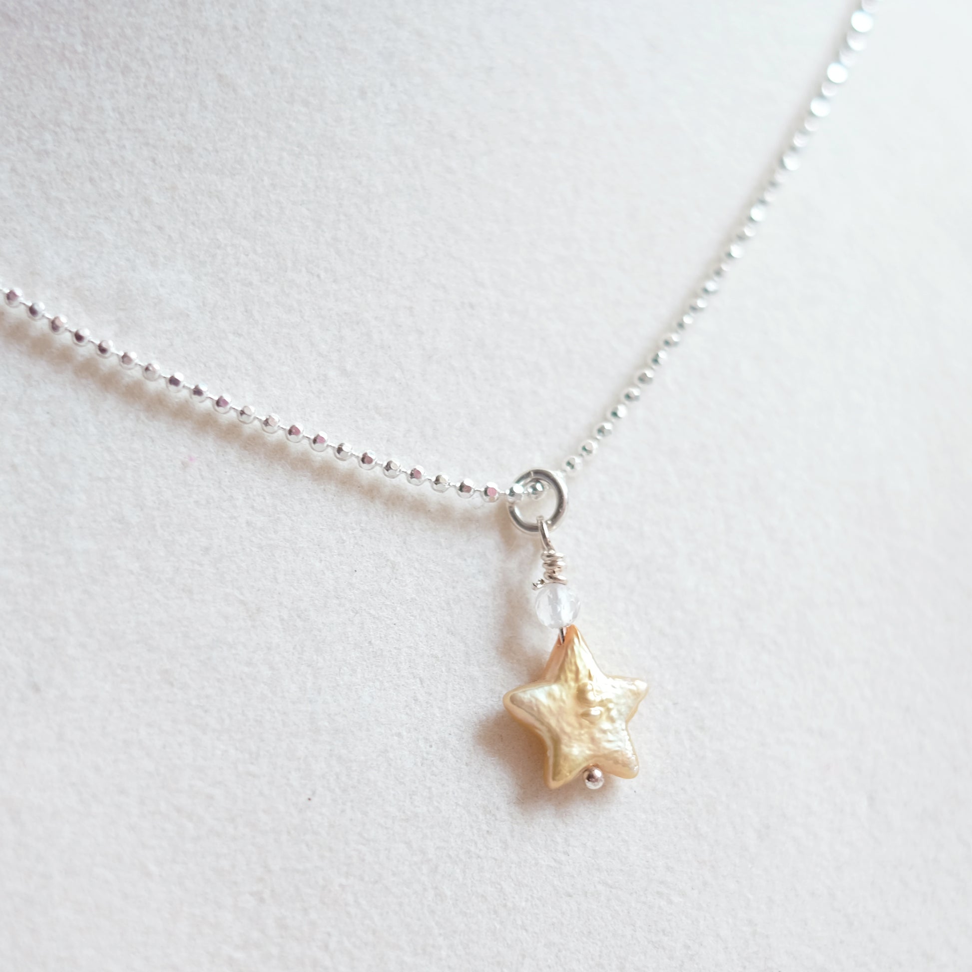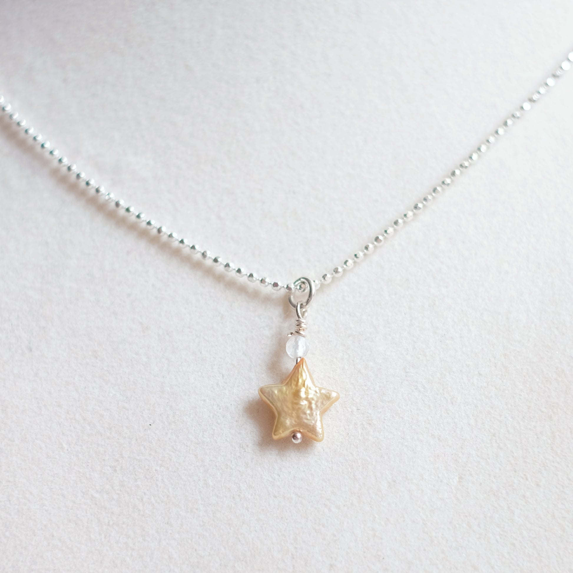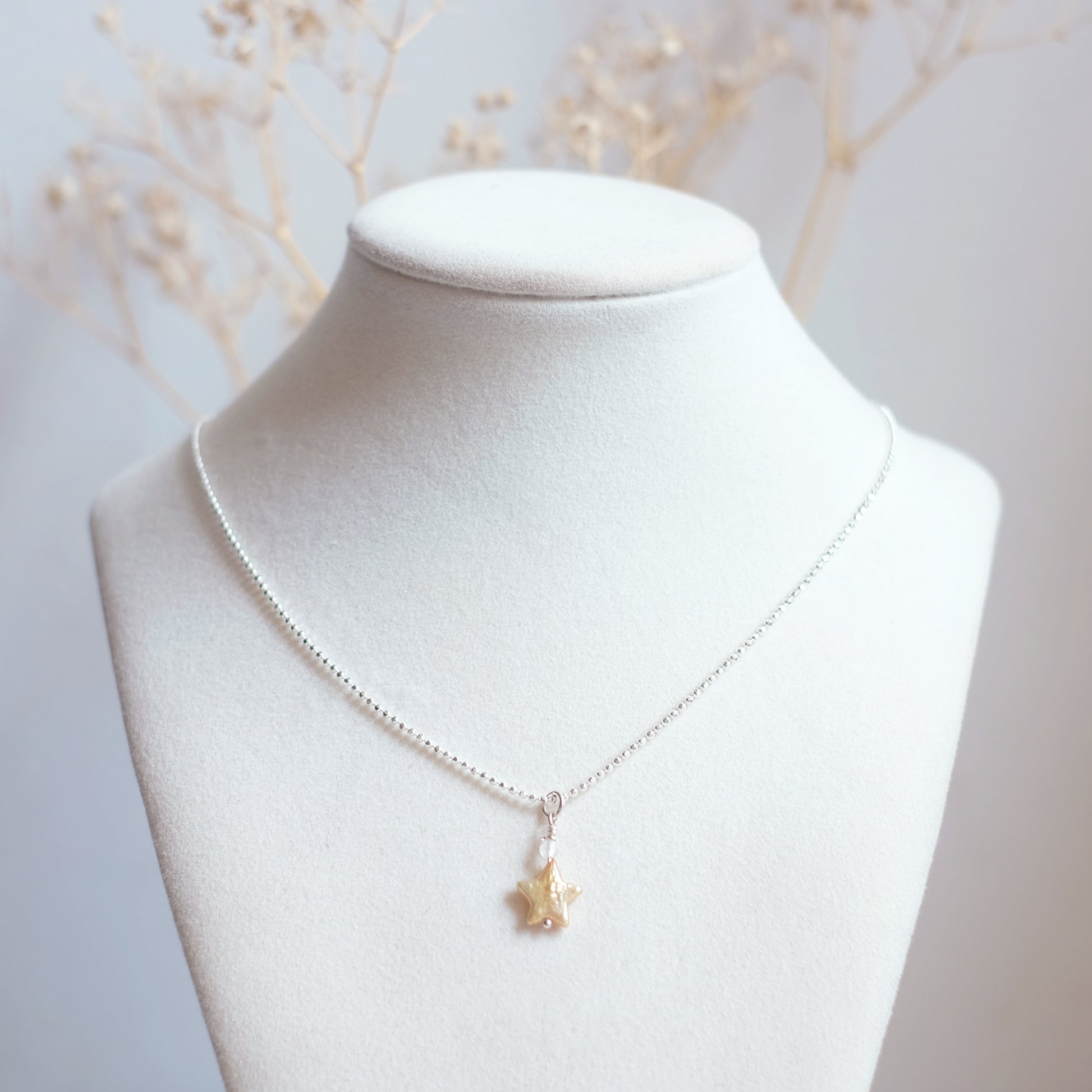This necklace is crafted in sterling silver and features a delicate yellow mother-of-pearl star paired with a shimmering white quartz. The combination captures a celestial, calming glow — like moonlight on gentle waves.