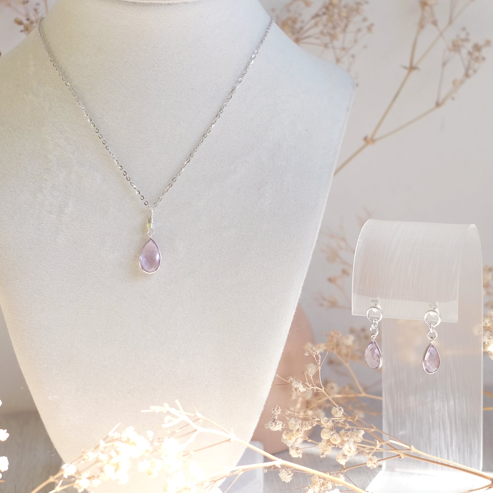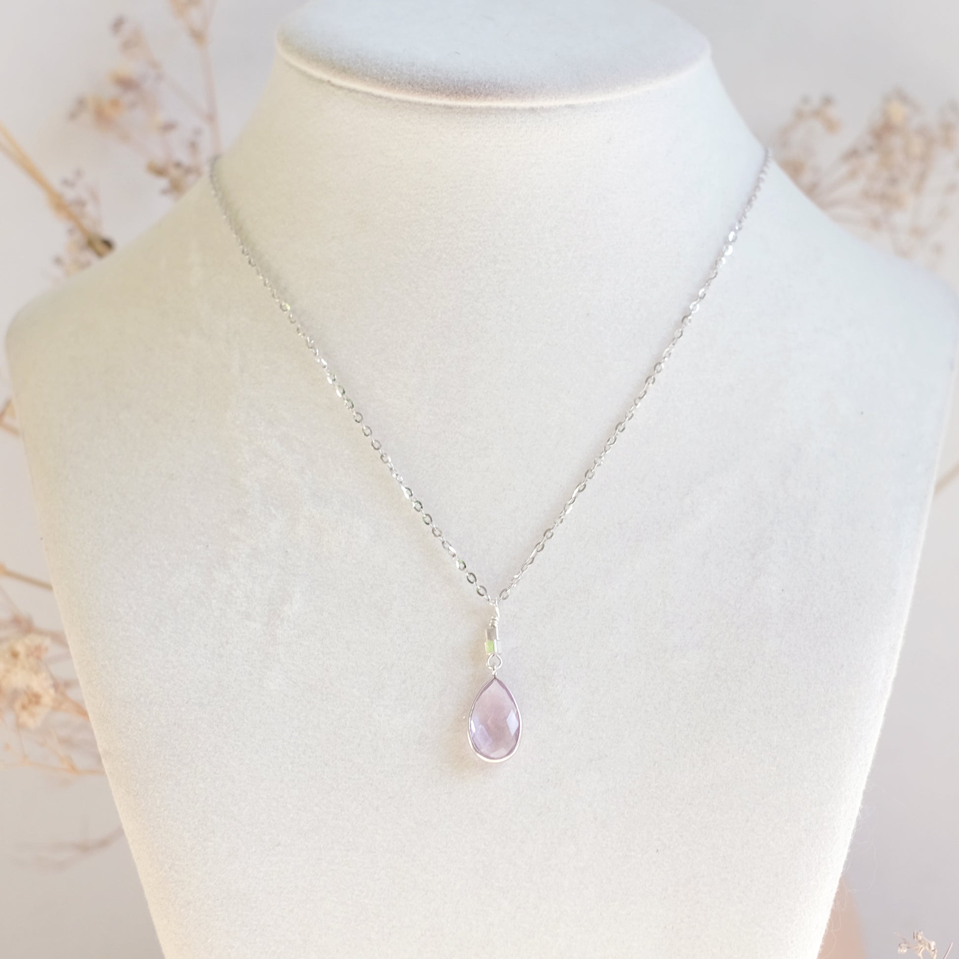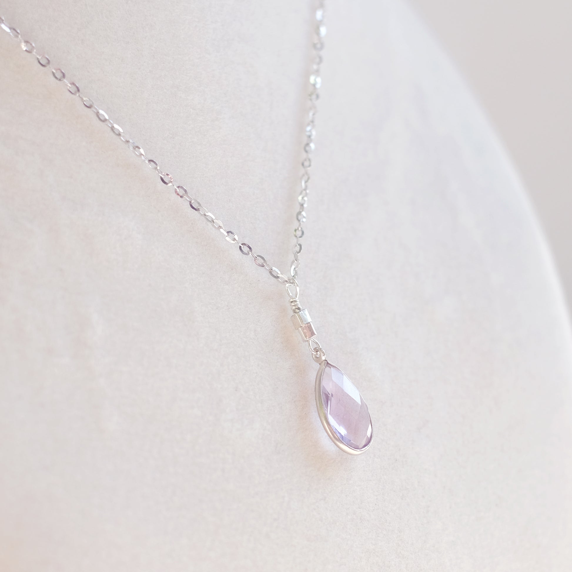 This necklace is crafted in high-quality sterling silver and features a natural amethyst in a delicate drop shape.