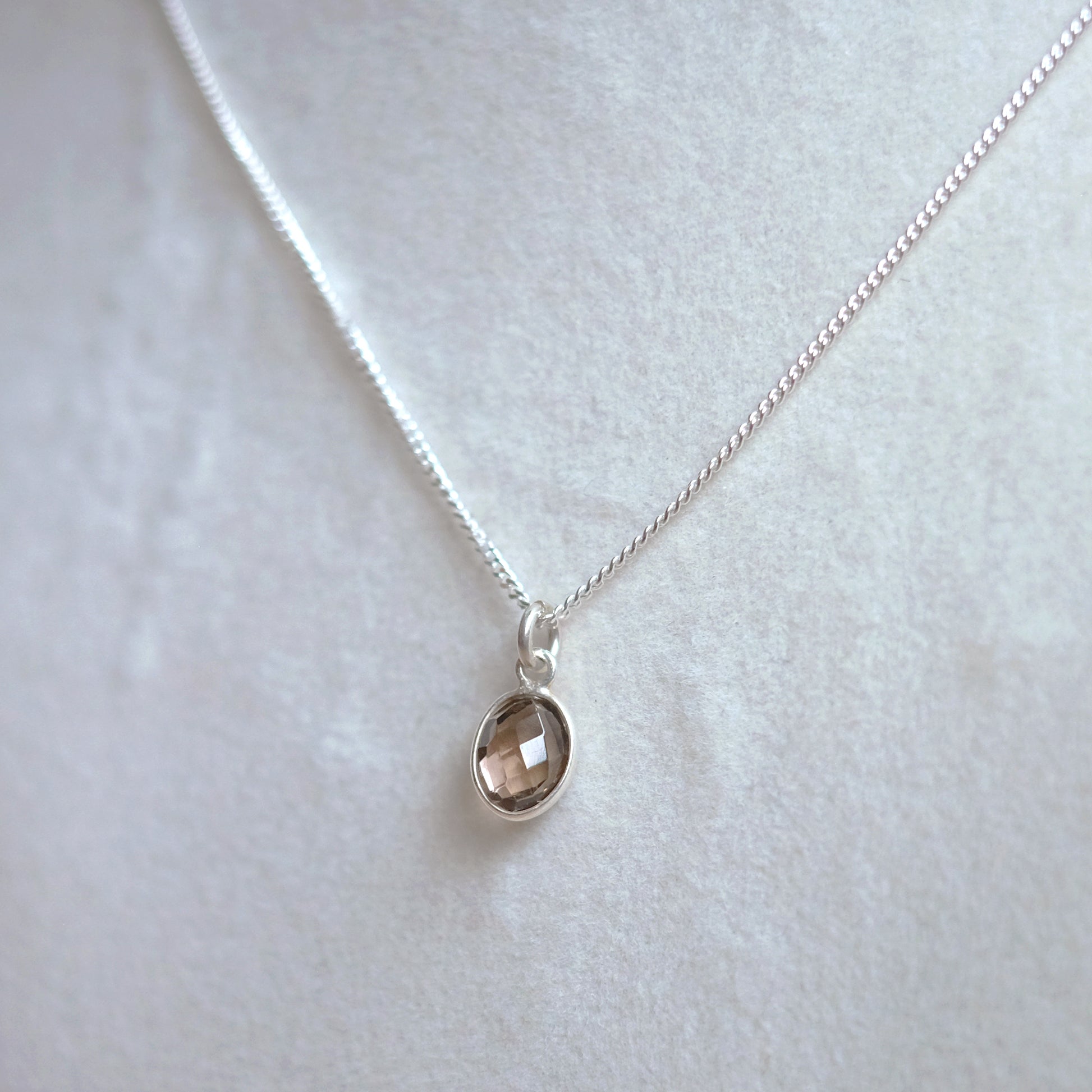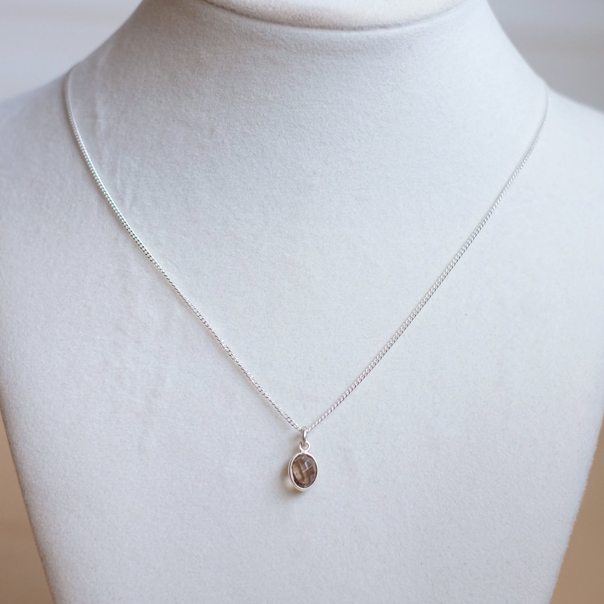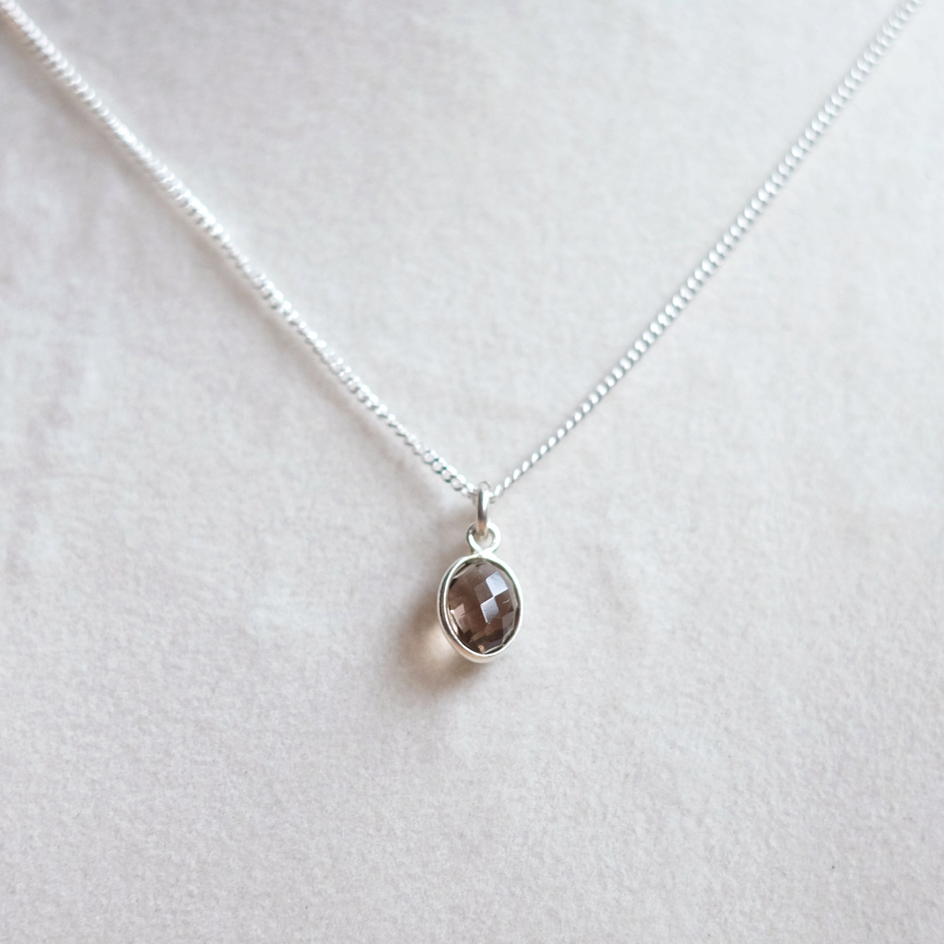 This necklace is crafted in sterling silver and set with a rich, warm smoky quartz in an elegant oval cut — a subtle yet powerful piece that invites peace and balance with every wear.