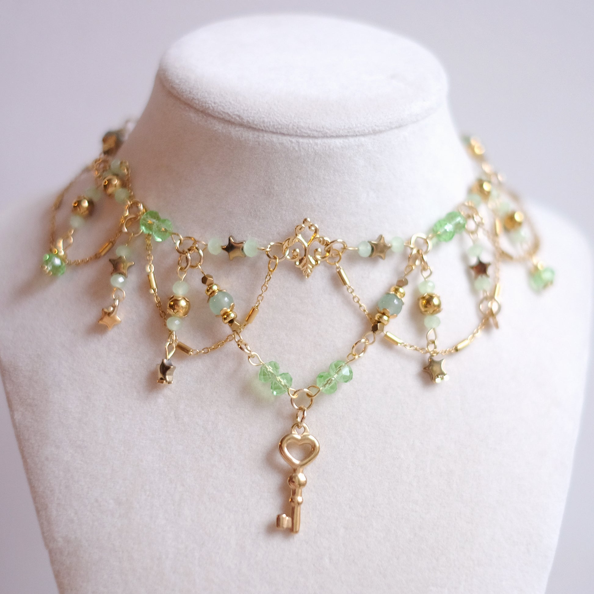The Secret Garden necklace set is an invitation to wander through a lush, enchanted haven, where golden afternoon light sparkles through leaves like tiny stars. Every detail evokes the quiet magic of a hidden garden bathed in mystery and poetry. Delicate stars glimmer like sunlight filtering through the branches, illuminating this secret sanctuary with a dreamy glow. A piece that captures the wonder of suspended moments — perfect for those who love to carry a touch of enchanted nature close to their heart.